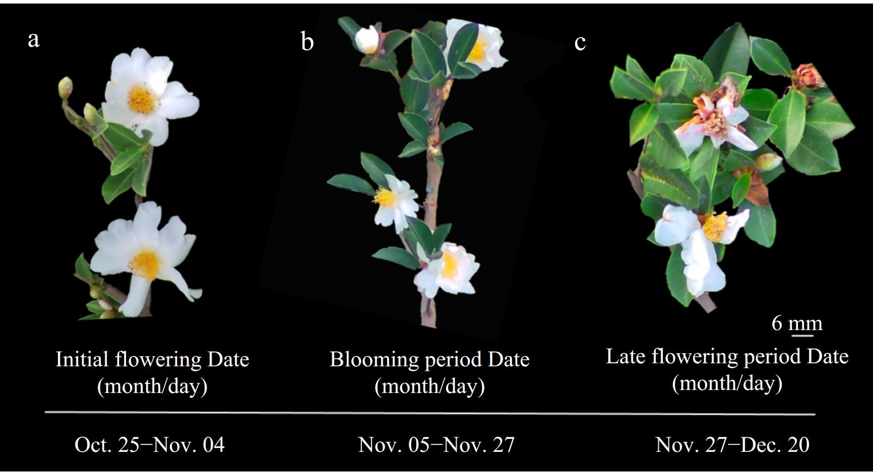 Flowering phenology of C. hainanica 'H4' in 2023. (a) Initial flowering date (Oct. 25–Nov. 4); (b) blooming period date (Nov. 5–Nov. 27); (c) late flowering period date (Nov. 27–Dec. 20).