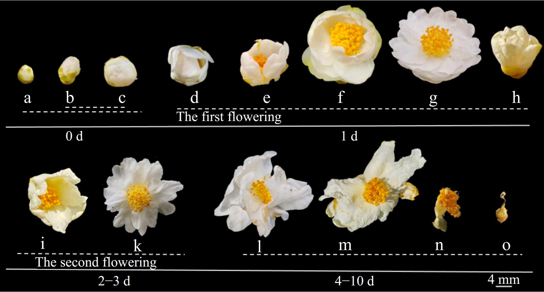 • The flowering duration of 'H4' lasts for 5–10 d, with the blooming dynamics of a single flower illustrated in Fig. 2. According to the degree of petal unfolding and the developmental states of the androecium and gynoecium, the flowering dynamics of a single C. hainanica flower were divided into five stages (Fig. 2): (1) non-blooming stage (Fig. 2ac), (2) slightly blooming stage (Fig. 2d, e), (3) first blooming stage (Fig. 2fh), (4) second blooming stage (Fig. 2im), and (5) wilting stage (Fig. 2n, o).