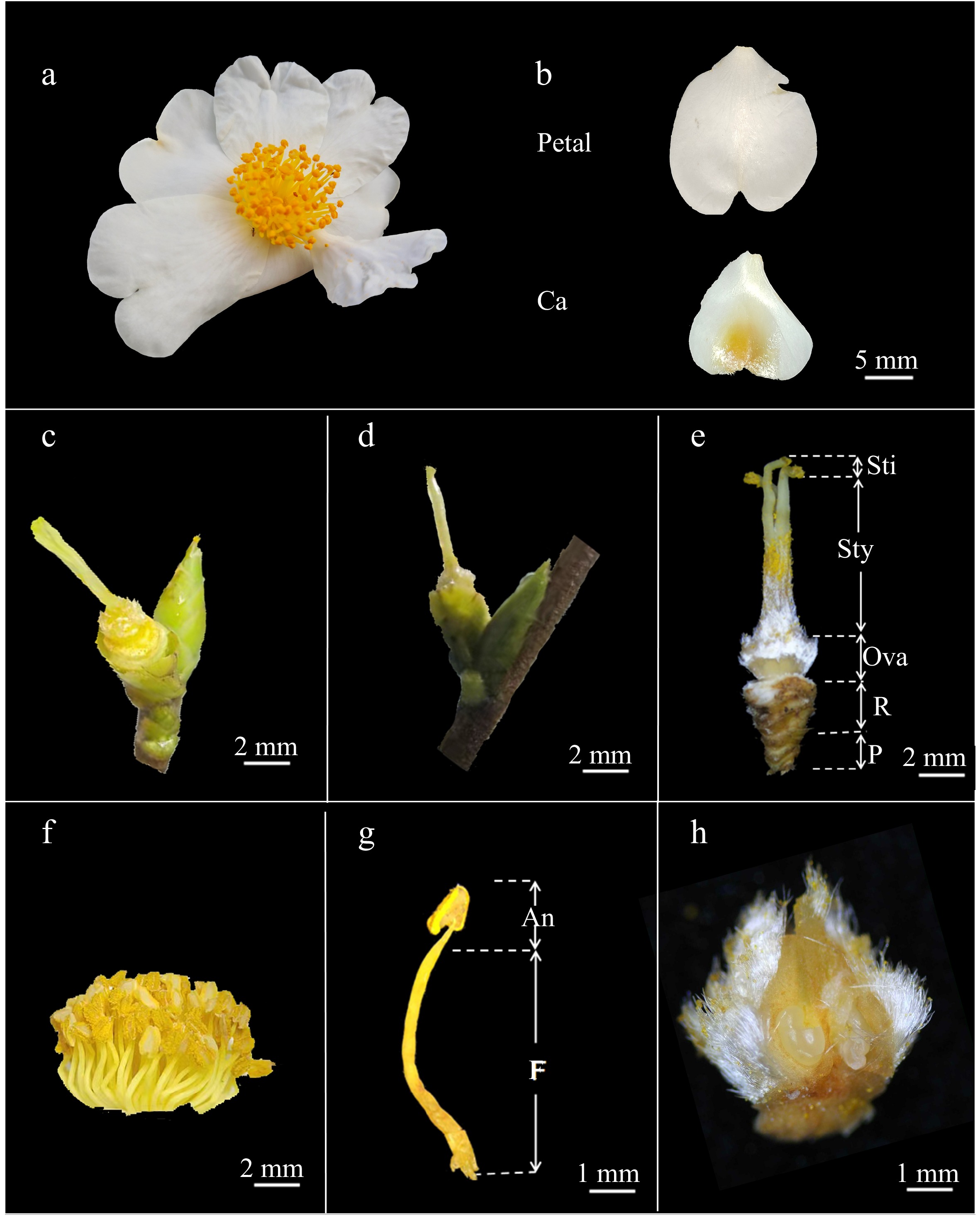 Organ morphology of C. hainanica. (a) External morphology of a flower; (b) morphological features of floral organs; (c) terminal flower bud; (d) axillary flower bud; (e) gynoecium morphology; (f) stamen group; (g) structure of anther; (h) ovary anatomy diagram. Petal: normal petals; Ca: petaloid sepal; An: anthers; F: filament; Sti: stigma; Sty: style; Ova: ovary; R: receptacle; P: pedicel.
