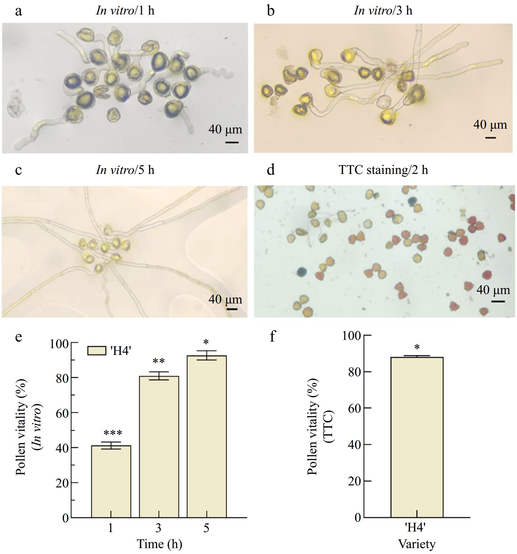 Determination of pollen viability of C. hainanica using different methods. (a) Pollen phenotype of 'H4' after in vitro germination for (a) 1 h, (b) 3 h; and (c) 5 h. (d) Pollen phenotype of 'H4' after TTC staining for 2 h. (e) Germination rate of 'H4' pollen after 1, 3, and 5 h of in vitro culture, (f) 'H4' pollen TTC staining for 2 h. The symbols (*, **, ***) were significantly different by Duncan's test at p ≤ 0.05.