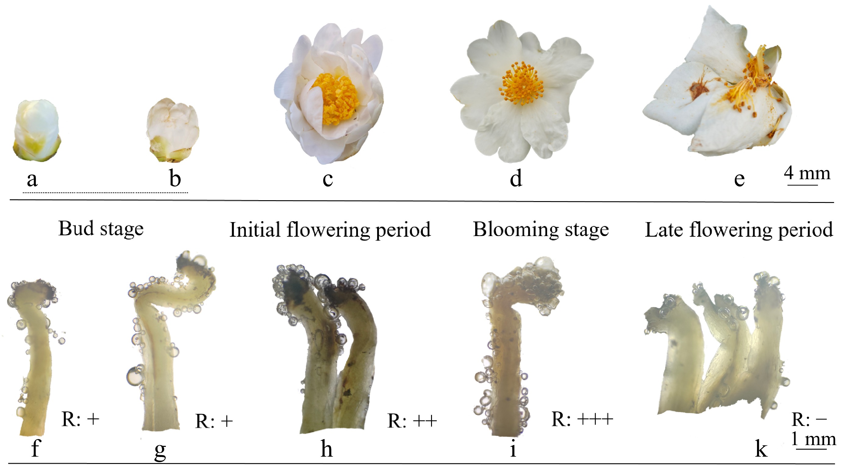 • The benzidine-hydrogen peroxide method was used to measure the stigmatic receptivity of 'H4'. The results are displayed in Fig. 5. At each flowering stage of C. hainanica, bubbles could be observed on the stigmas, but their number and size varied. It was found that during the bud stage, only a small number of bubbles were produced on the stigma (Fig. 5f, g). However, the number of bubbles was greatest during the early and peak flowering stages, suggesting the strongest receptivity on the stigma (Fig. 5h, i). Stigmatic receptivity was lowest during the late flowering stage (Fig. 5k).