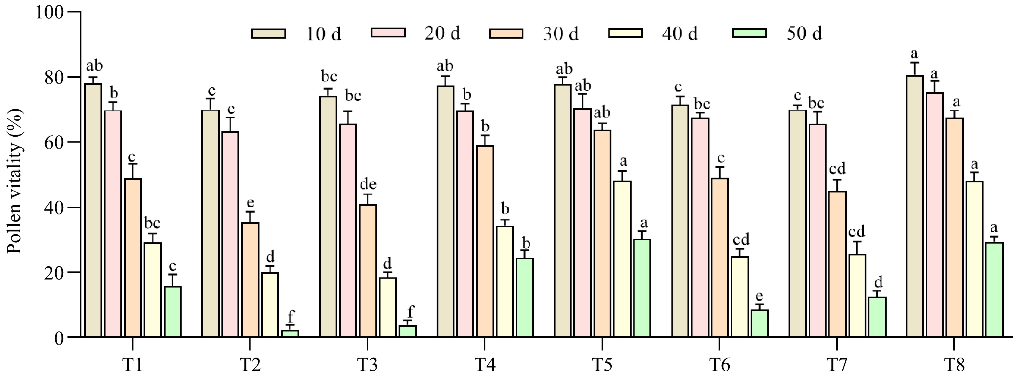 Study on the effects of different treatment methods on the storage of C. hainanica pollen. T1 = RT + sealed + Fresh; T2 = RT + sealed & dry + Dried; T3 = 4 °C + sealed + Dried; T4 = 4 °C + sealed & dry + Fresh; T5 = −20 °C + sealed + Dried; T6 = −20 °C + sealed & dry + Fresh; T7 = −80 °C + sealed + Fresh; T8 = −80 °C + sealed & dry + Dried; 10 d, 20 d, 30 d, 40 d, 50 d = The number of days in storage. The different lowercase letters were significantly different by Duncan's test at p ≤ 0.05. (All data were compared horizontally at the same time).