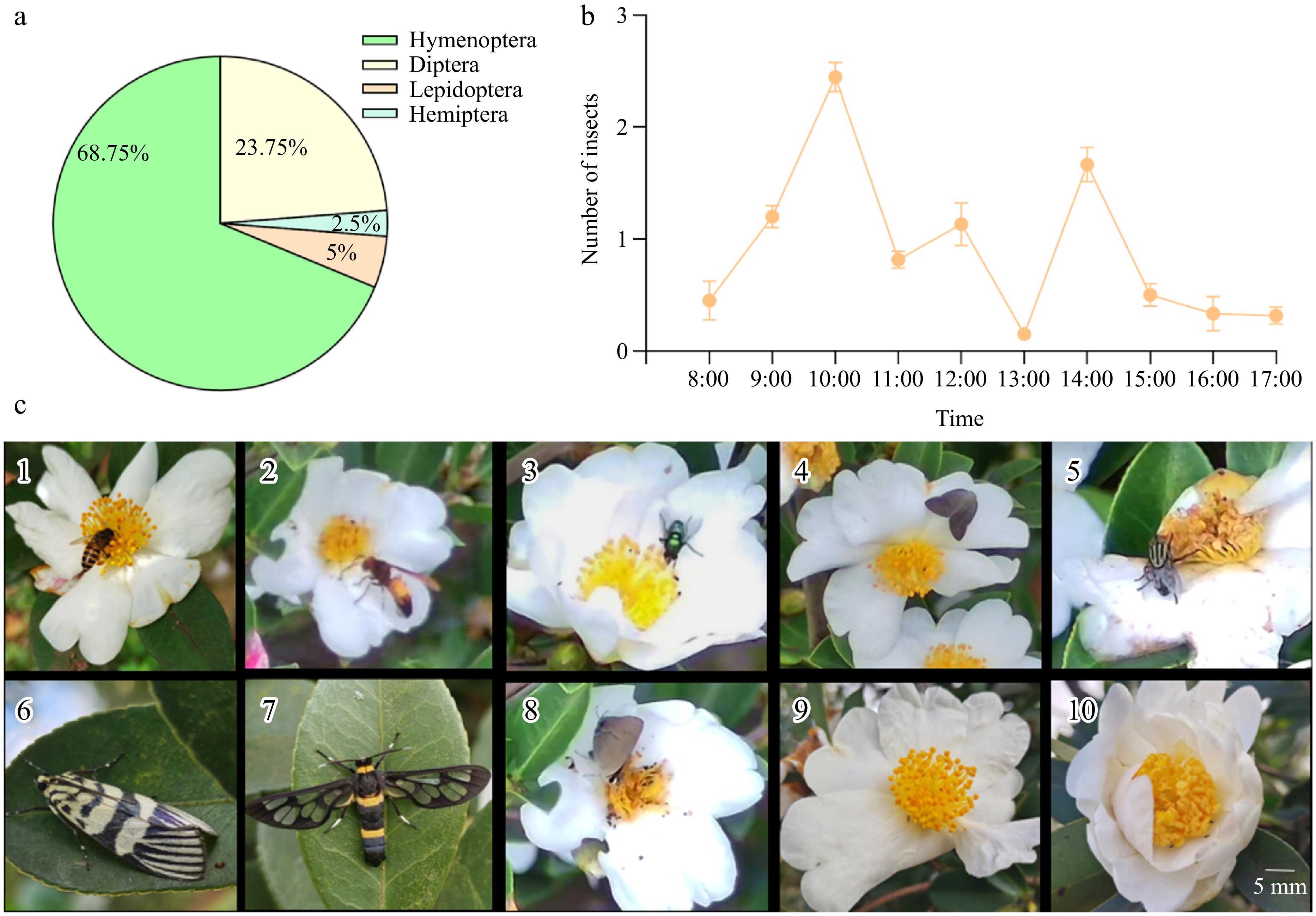 • Approximately nine insect species, representing four orders, were observed visiting the flowers of C. hainanica 'H4'. The most prevalent order was Hymenoptera, accounting for 68.75% of all flower-visiting insects, followed by Diptera (23.75%), Lepidoptera (5%), and Hemiptera (2.5%) (Fig. 7a). The most abundant species was Apis cerana. The daily activity patterns of flower-visiting insects were recorded from 8:00 to 17:00, with the visitation frequency shown in Fig. 7b. Insect activity peaked at 10:00 and 14:00, whereas lower activity levels were observed during the early morning (8:00–9:00), late afternoon (13:00–17:00), and midday (13:00).