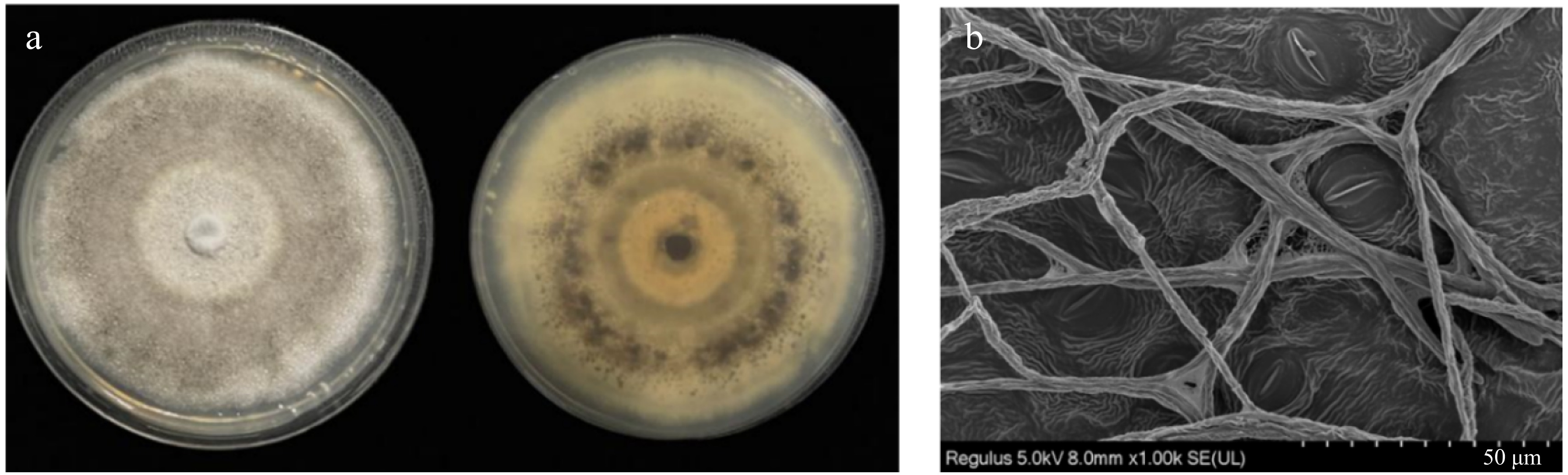 The pathogen was successfully isolated from diseased leaves collected in the field and cultured on potato dextrose agar (PDA) medium. Morphological characterization of the anthracnose mycelia was investigated. The cultured colonies were round with isodiametric and radial growth, featuring a smooth surface and well-defined edges. Initially, the hyphae were white, gradually turning dark gray. The aerial hyphae were robust, starting as white, then turning grey, and finally forming a dark gray flocculent structure (Fig. 1a). The mycelia were dense and slender (Fig. 1b), with morphological traits consistent with those of Colletotrichum spp. Additionally, the ITS region of the ribosomal DNA (rDNA) from the isolated pathogen was sequenced to identify the strain. The ITS sequence showed over 99% homology with both C. gloeosporioides and C. alatae. To further confirm the type of strain, the rDNA-CAL region was amplified via PCR using the specific primer to obtain a DNA fragment of approximately 700 bp in length (Supplementary Fig. S1). The rDNA CAL sequence shared over 99% homology exclusively with C. alatae. Based on these molecular biology findings, the isolated and purified strain was identified as C. alatae.