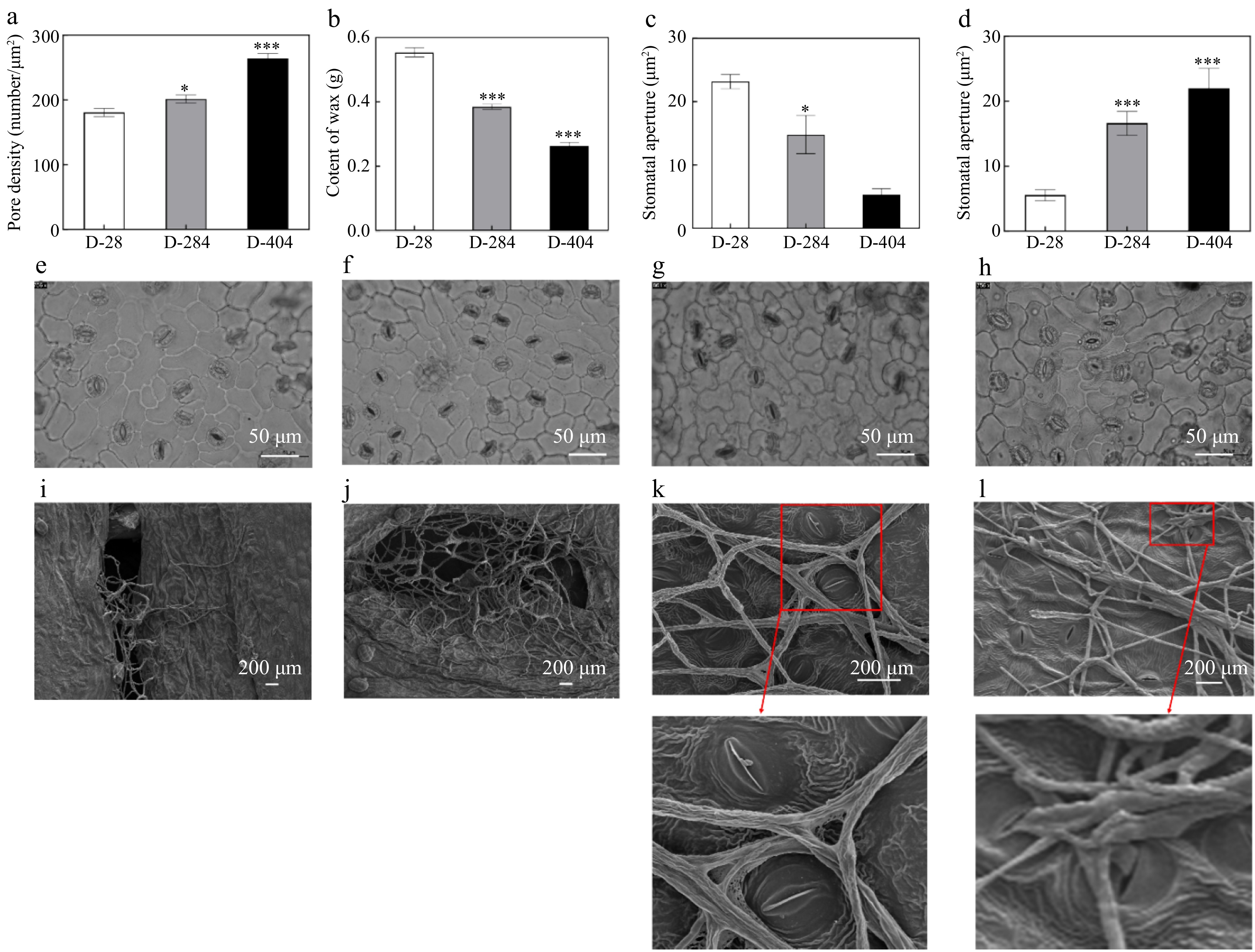 The susceptible variety D-404 and the resistant variety D-284 had relatively high stomatal densities, while the immune variety D-28 had the lowest. The stomatal densities of the susceptible D-404 and resistant D-284 were significantly higher compared to the immune D-28 (Fig. 2a). The immune variety D-28 had the highest wax content at 0.56 ± 0.02 g, followed by the resistant D-284 at 0.385 ± 0.04 g, with the susceptible D-404 having the lowest at 0.270 ± 0.04 g. The wax content in the susceptible variety was significantly lower than that in the immune variety (Fig. 2b). Before inoculation with the anthracnose pathogen, the immune variety D-28 had the largest stomatal opening, and the variety D-404 had the smallest (Fig. 2c). The stomatal microstructure revealed that the most stomata in the leaves of the disease resistant variety D-284 were open, whereas those in the susceptible variety D-404 were predominantly closed (Fig. 2e & f). After inoculation with the anthracnose pathogen, the immune variety D-28 had the smallest stomatal opening, followed by the resistant variety D-284, while the susceptible variety D-404 had the largest stomatal opening (Fig. 2d). The stomatal microstructure of the resistant and sensitive varieties also confirmed the above results. After inoculation, most stomata in the resistant variety D-284 were closed (Fig. 2g & k), whereas most of the leaf stomata of the susceptible variety D-404 were open (Fig. 2h & l). Scanning electron microscopy revealed that anthracnose mycelia grew and enriched more rapidly in the susceptible variety during the early stage of inoculation (Fig. 2i & j), and it was observed that anthracnose mycelia could invade through the stomata of the leaves (Fig. 2k & l).
