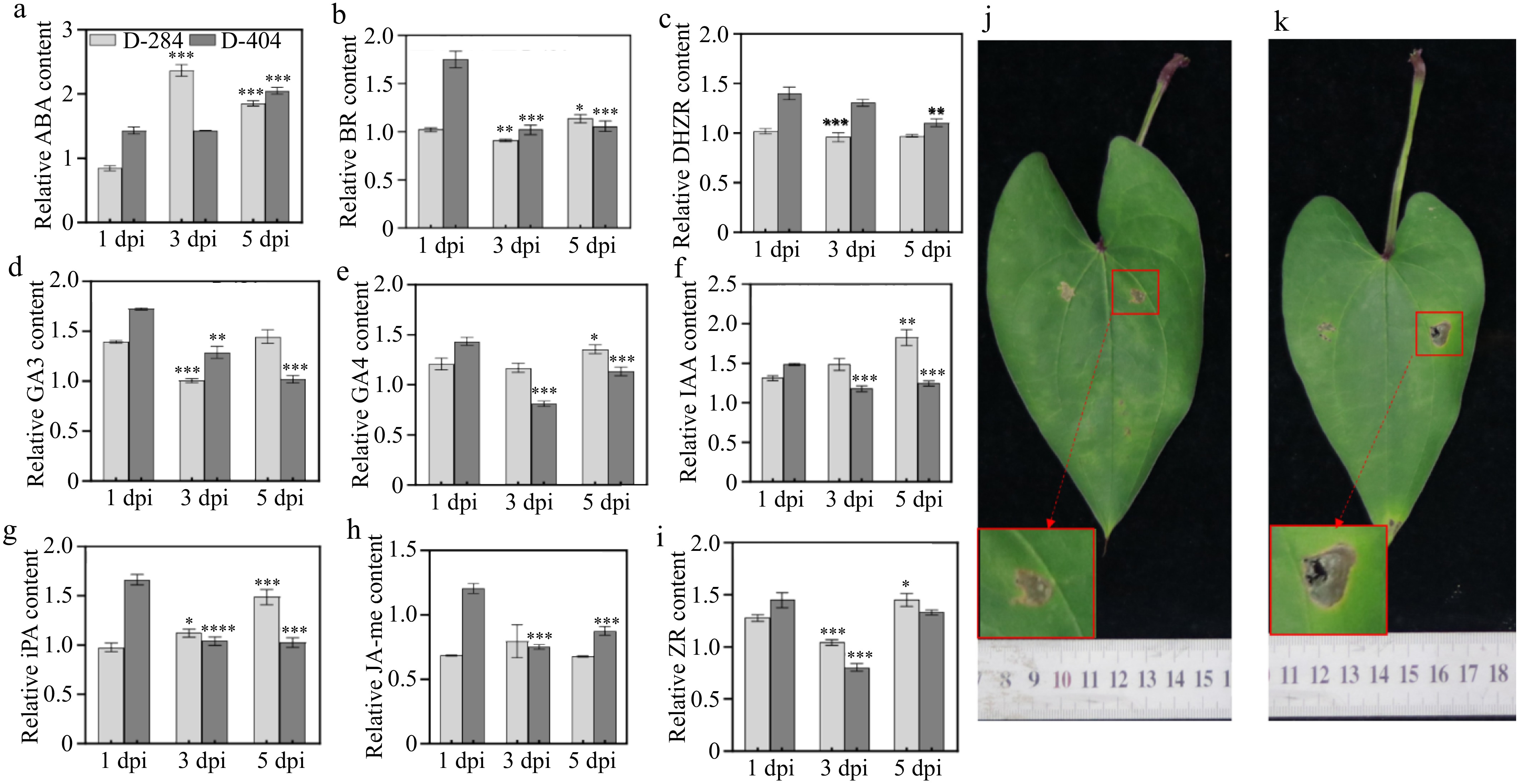 The ABA content in the leaves of the resistant variety D-284 initially increased but then declined over time, reaching a maximum at 3 dpi. In contrast, the ABA content in the susceptible variety D-404 leaves remained relatively stable initially and only increased significantly at 5 dpi (Fig. 3a).