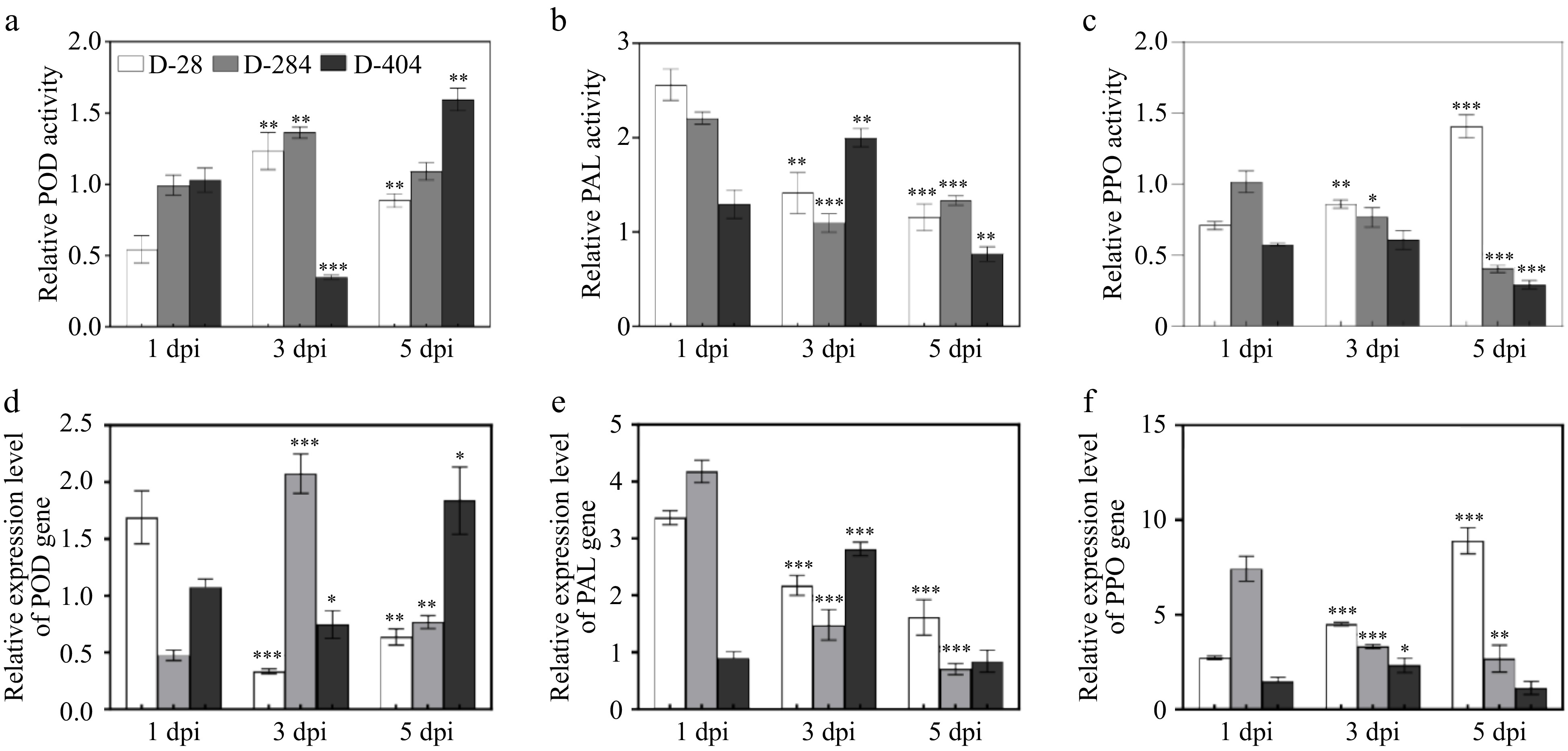 POD activity increased at 3 dpi in both the immune variety D-28 and resistant variety D-284, while in the susceptible variety D-404, it was downregulated at 3 dpi and upregulated at 5 dpi (Fig. 4a). The POD-encoding gene was upregulated at 1 dpi in the immune variety D-28, 3 dpi in the resistant variety D-284, 3 dpi in the resistant variety D-284, and at 5 dpi in the susceptible variety D-404 (Fig. 4d). PAL activity increased at 1 dpi in the immune variety D-28 and the resistant variety D-284, and at 3 dpi in the susceptible variety D-404. The expression of PAL-encoding gene was upregulated at 3 dpi (Fig. 4b), with the increasing trend of PAL gene expression aligning with enzyme activity (Fig. 4e); PPO activity showed little change at 1 and 3 dpi in all varieties. However, the resistant variety D-284 and the susceptible variety D-404 exhibited downregulation at 5 dpi, whereas the immune variety D-28 showed upregulation (Fig. 4c). There was a consistent upregulation trend of PPO-encoding gene in the variety D-28 and the resistant variety D- 284 following inoculation (Fig. 4f).