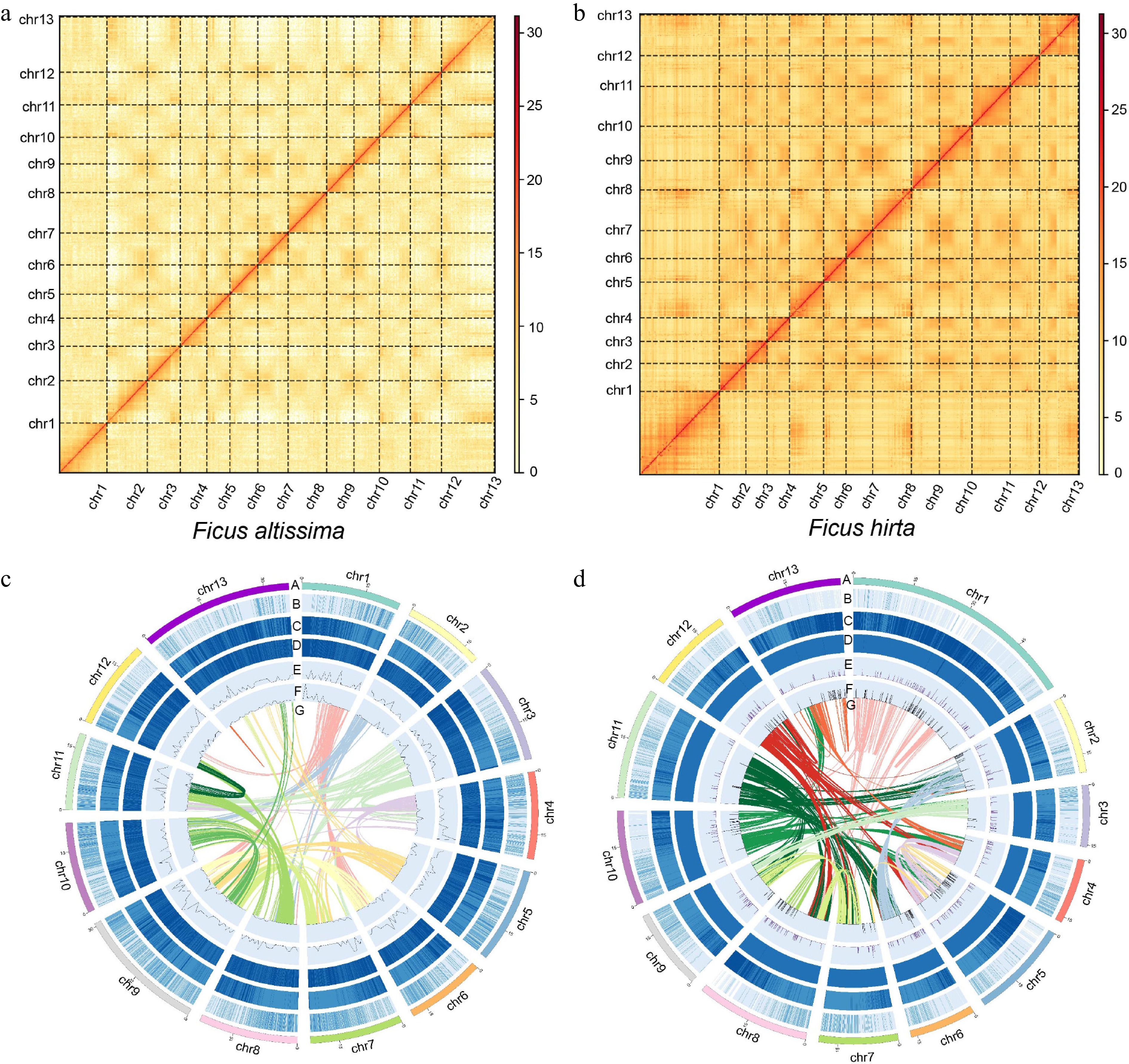 The Hi-C results and genomic characteristics of Ficus. (a) Hi-C results of F. altissima. (b) Hi-C results of F. hirta. (c) The Circos plot showing the genome details of F. altissima: A, thirteen chromosomes of F. altissima; B, gene density; C, repeat sequence content; D, GC content density; E, density of Copia LTR–RTs; F, density of Gypsy LTR–RTs; G, syntenic blocks (all window sizes = 50 kb). (d) The Circos plot showing the genome details of F. hirta. A, B, C, D, E, F, G: A, thirteen chromosomes of F. hirta; B, gene density; C, repeat sequence content; D, GC content density; E, density of Copia LTR–RTs; F, density of Gypsy LTR–RTs; G, syntenic blocks (all window sizes = 50 kb).