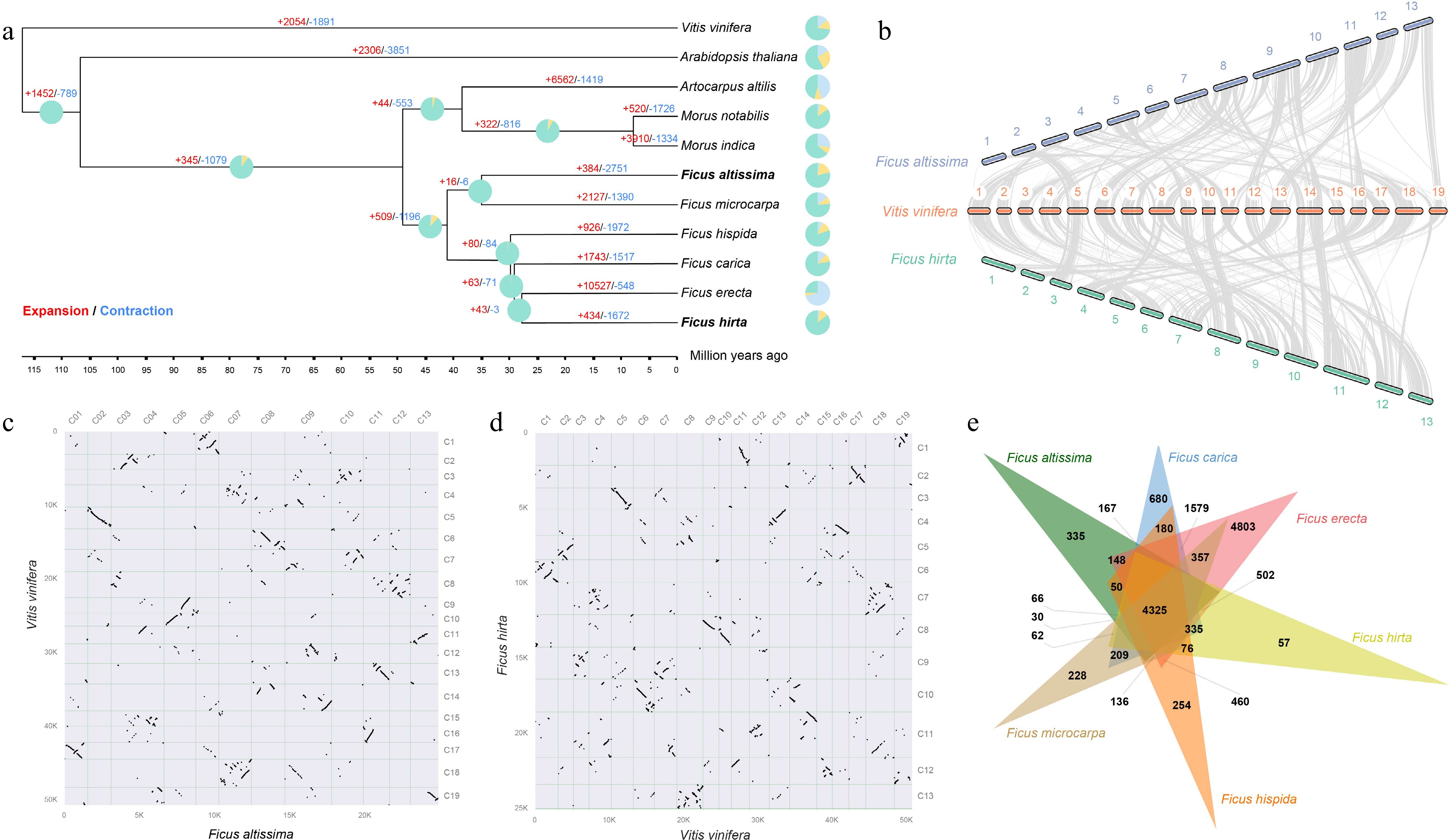 Evolutionary analysis of the Ficus genus and the genomes of F. altissima and F. hirta. (a) Phylogenetic tree showing F. altissima, F. hirta, and nine other species, along with divergence times and the expansion and contraction of gene families. Green represents gene retention, yellow represents gene contraction, and blue represents gene expansion. (b) Synteny analysis between F. altissima, F. hirta, and Vitis vinifera. (c) Dot plot of F. altissima and V. vinifera. (d) Dot plot of F. hirta and V. vinifera. (e) Venn diagram showing the shared orthologous gene groups among the genomes of the Ficus species.
