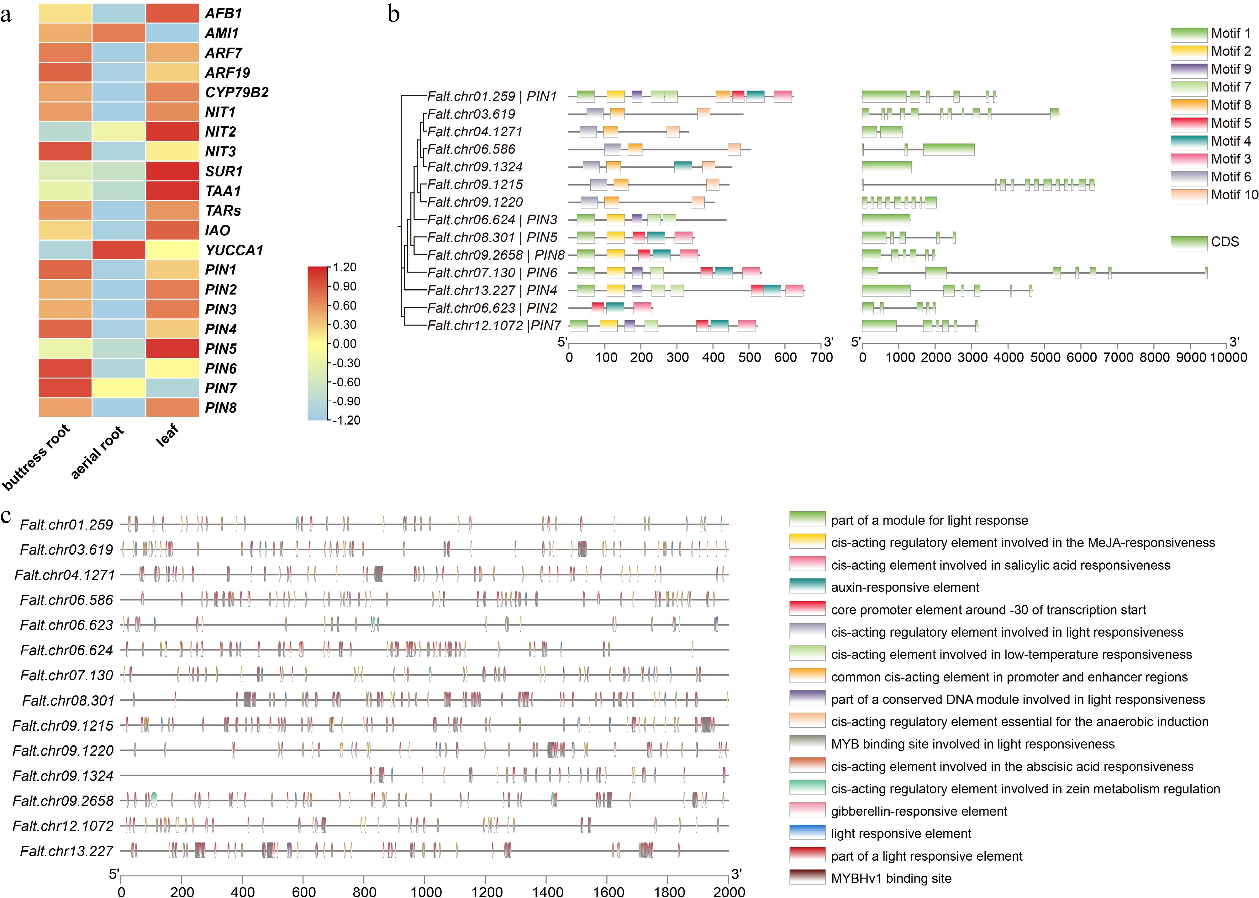 Characteristics of the PIN gene family in F. altissima. (a) Heatmap of auxin-related genes in F. altissima. (b) Phylogenetic relationships, conserved motifs, and gene structure of the PIN gene family in F. altissima. (c) The role of cis-elements in the PIN gene family of F. altissima.