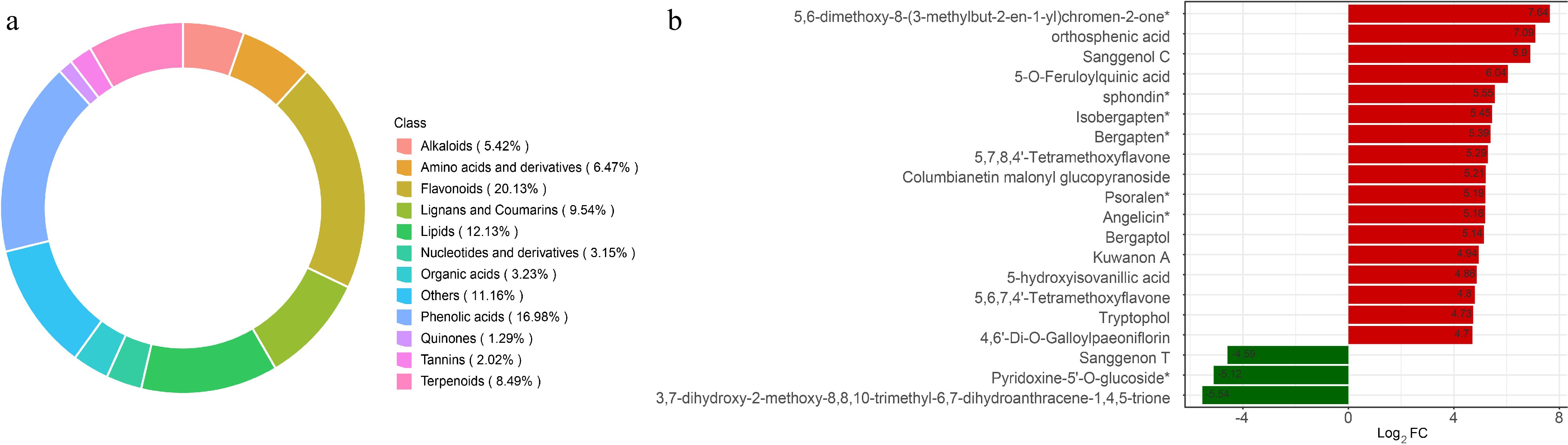(a) Total metabolites extracted from the thin root, medium root, and course root. (b) Differentially expressed top 20 metabolites between thin root and course root, showing that psoralen is highly expressed in the course root.