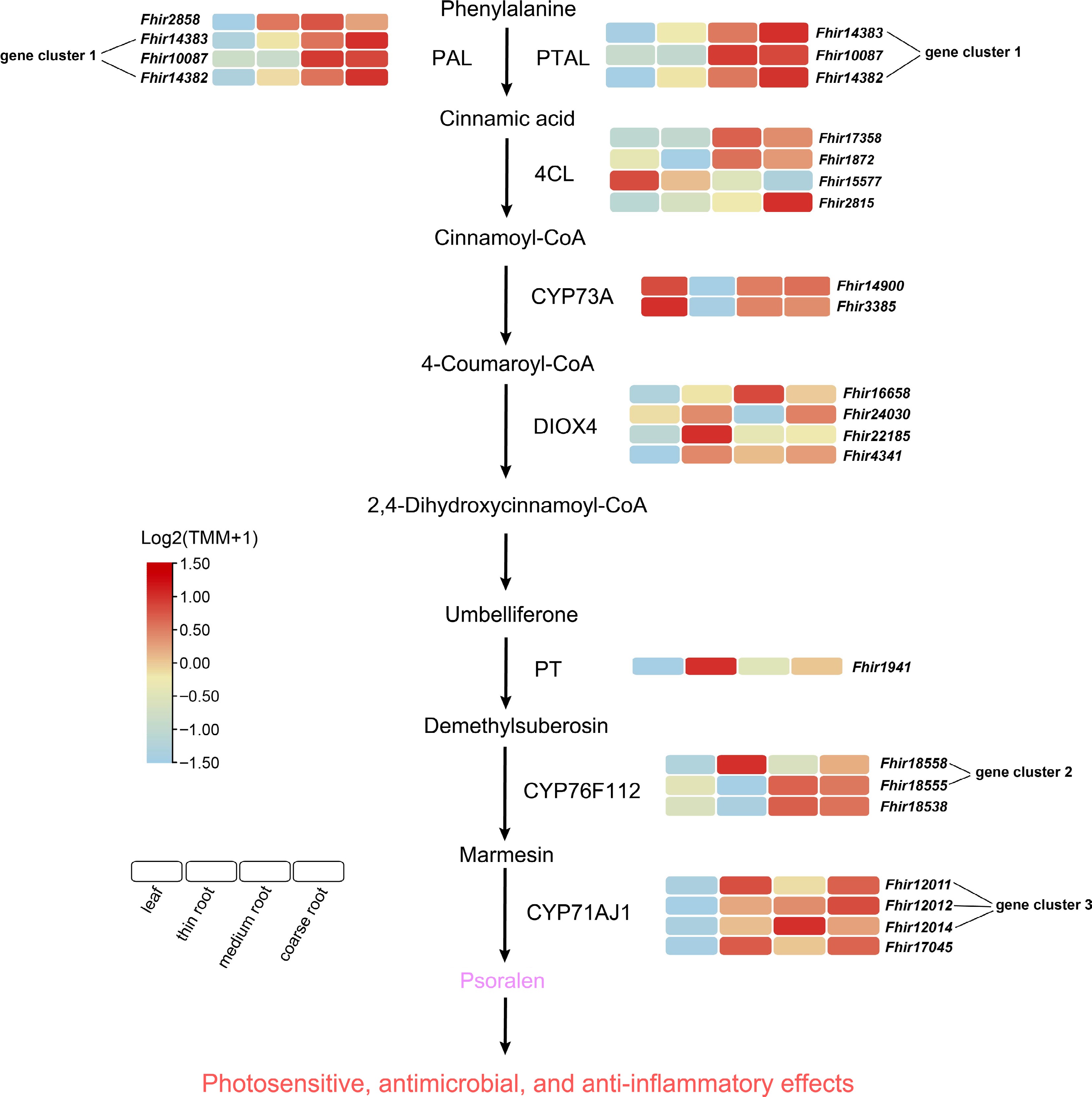 Among the top 20 differentially accumulated metabolites between thin and coarse roots, psoralen was highly enriched in coarse roots (Fig. 4b). Psoralen, a member of the coumarin class, is primarily synthesized via the phenylalanine metabolic pathway[43]. To elucidate the biosynthetic mechanism of psoralen in F. hirta roots, we integrated metabolomic and transcriptomic analyses, identifying 11 highly expressed genes involved in its biosynthesis. These include phenylalanine ammonia-lyase (Genes include: Fhir2858, Fhir14383, Fhir10087, Fhir14382), phenylalanine/tyrosine ammonia-lyase (Fhir14383, Fhir10087, Fhir14382), 4-coumarate-CoA ligase (Fhir2815), feruloyl-CoA 6-hydroxylase (Fhir16658, Fhir22185), umbelliferone 6-dimethylallyltransferase (Fhir1941), marmesin synthase (Fhir18558), and psoralen synthase (Fhir12011, Fhir12014) (Fig. 5). Additionally, we found that Fhir14382 and Fhir14383 in phenylalanine ammonia-lyase and phenylalanine/tyrosine ammonia-lyase, Fhir18558 in marmesin synthase, and Fhir12011, Fhir12012, and Fhir12014 in psoralen synthase form gene clusters. These clustered genes appear to be co-regulated in response to specific biosynthetic regulatory signals. Their coordinated expression suggests an active role in promoting psoralen biosynthesis, highlighting their importance in the metabolic regulation of psoralen production in F. hirta roots. By participating in key enzymatic reactions, these genes not only influence psoralen yield but may also affect its bioactivity.