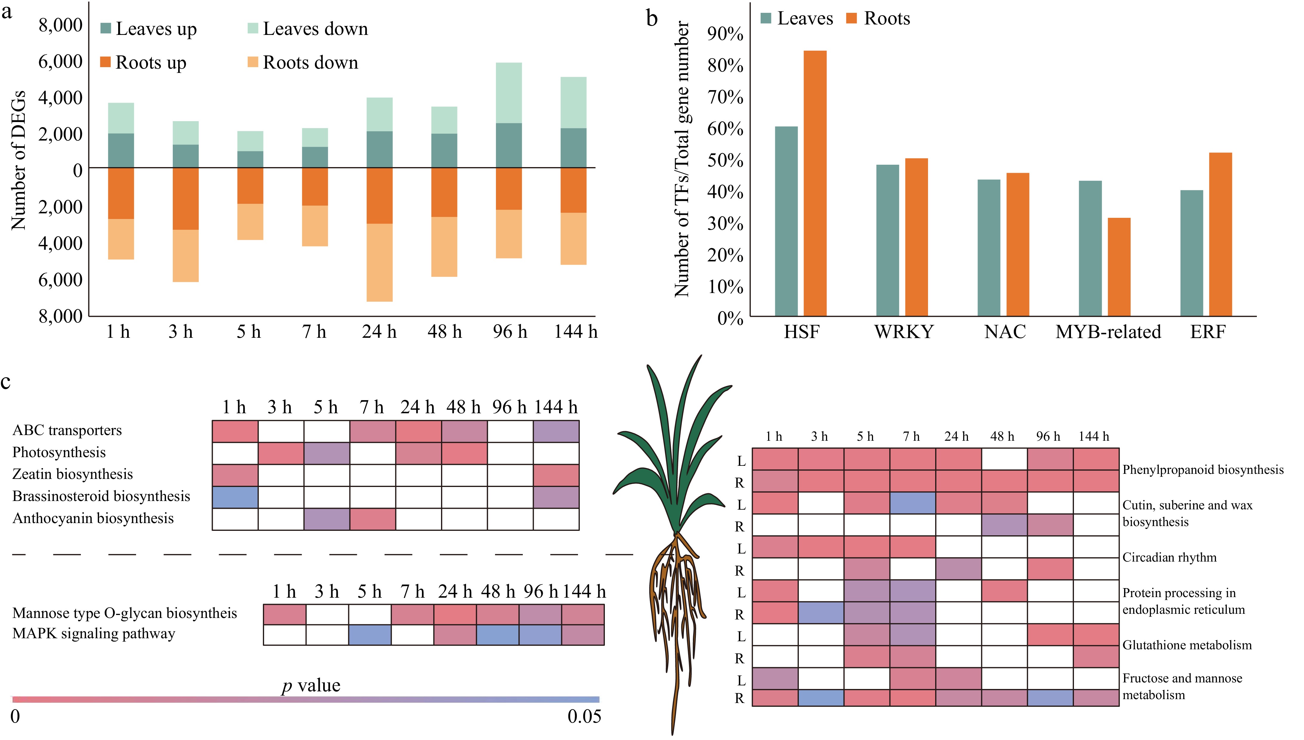 DEGs in leaf and root of pearl millet at eight time points under high-temperature stress. (a) Number of DEGs in the leaves and roots of pearl millet under high temperature stress. Green and yellow represent leaves and roots respectively, and light and dark colors are used to distinguish up-regulated and down-regulated DEGs. (b) The percentage of differentially expressed HSFs, WRKYs, NACs, MYB-relatives, and ERFs. Green and yellow represent leaves and roots respectively. (c) KEGG enrichment analysis of DEGs. White indicates p value > 0.05.