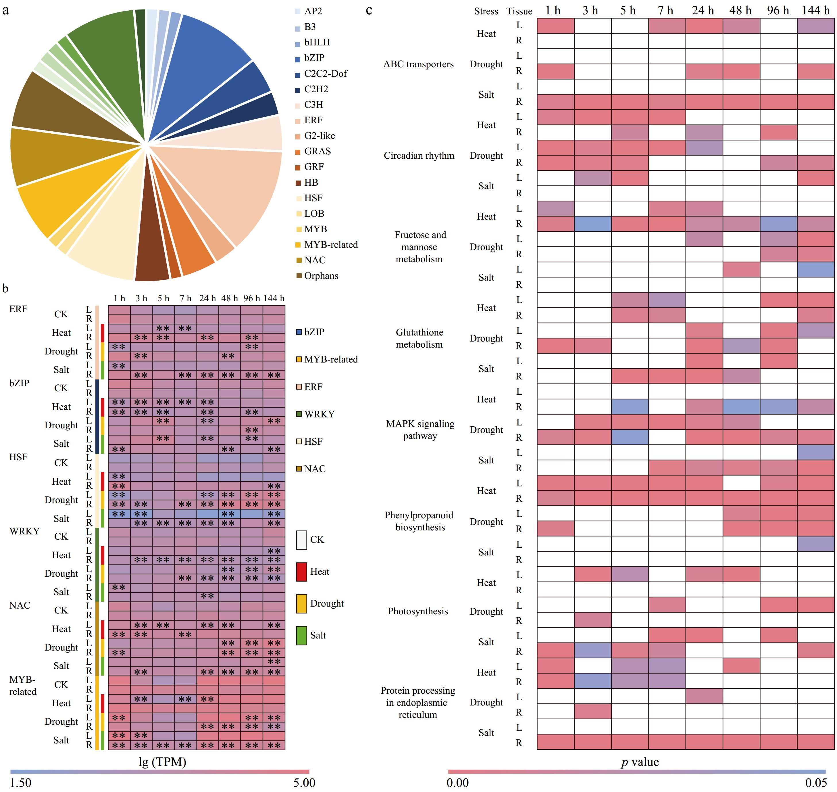 TFs and KEGG pathways identified both under high temperature, drought and salt stress. (a) The ratio of specific TFs to differentially expressed TFs (70 TFs) in response to the three stresses showed that the proportion of ERFs, bZIPs, HSFs, and WRKYs gene families was 2.87% (9/70), 10% (7/70), 8.57% (6/70), and 8.57% (6/70), respectively. (b) Expression patterns of TFs in leaves and roots of Pearl millet responding to three stresses at eight time points. (c) The KEGG pathway was identified in all three types of stress (high temperature, drought and salt stress). The white square represents p value > 0.05.