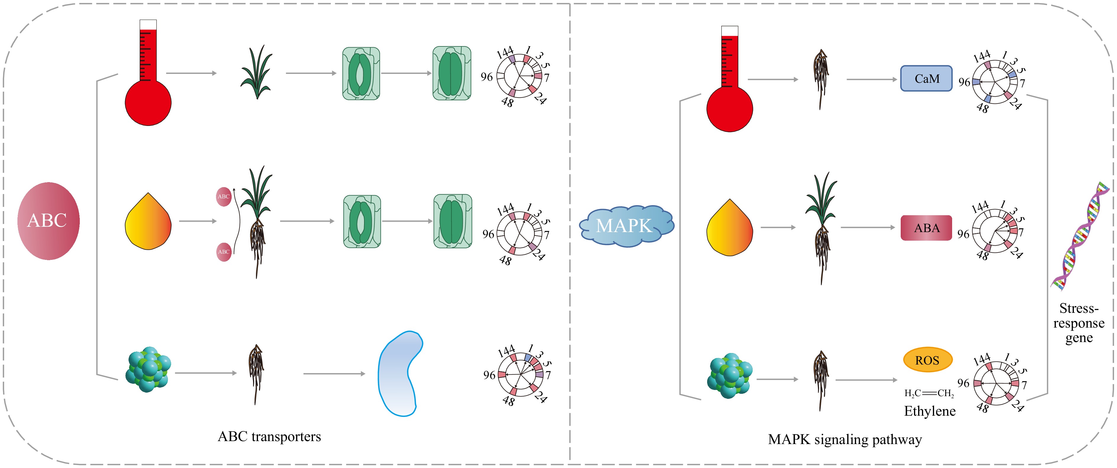 The same pathway has different mechanisms in response to high temperature, drought and salt stress. ABC in the leaves of pearl millet responds to high temperature by mediating stomatal movement. ABC transporters in the roots of pearl millet play roles in transporting ABA and ions under drought and salt stress, respectively. The MAPK pathway is activated by Ca2+, ABA, and ROS signals under high-temperature, drought, and salt stress, respectively.