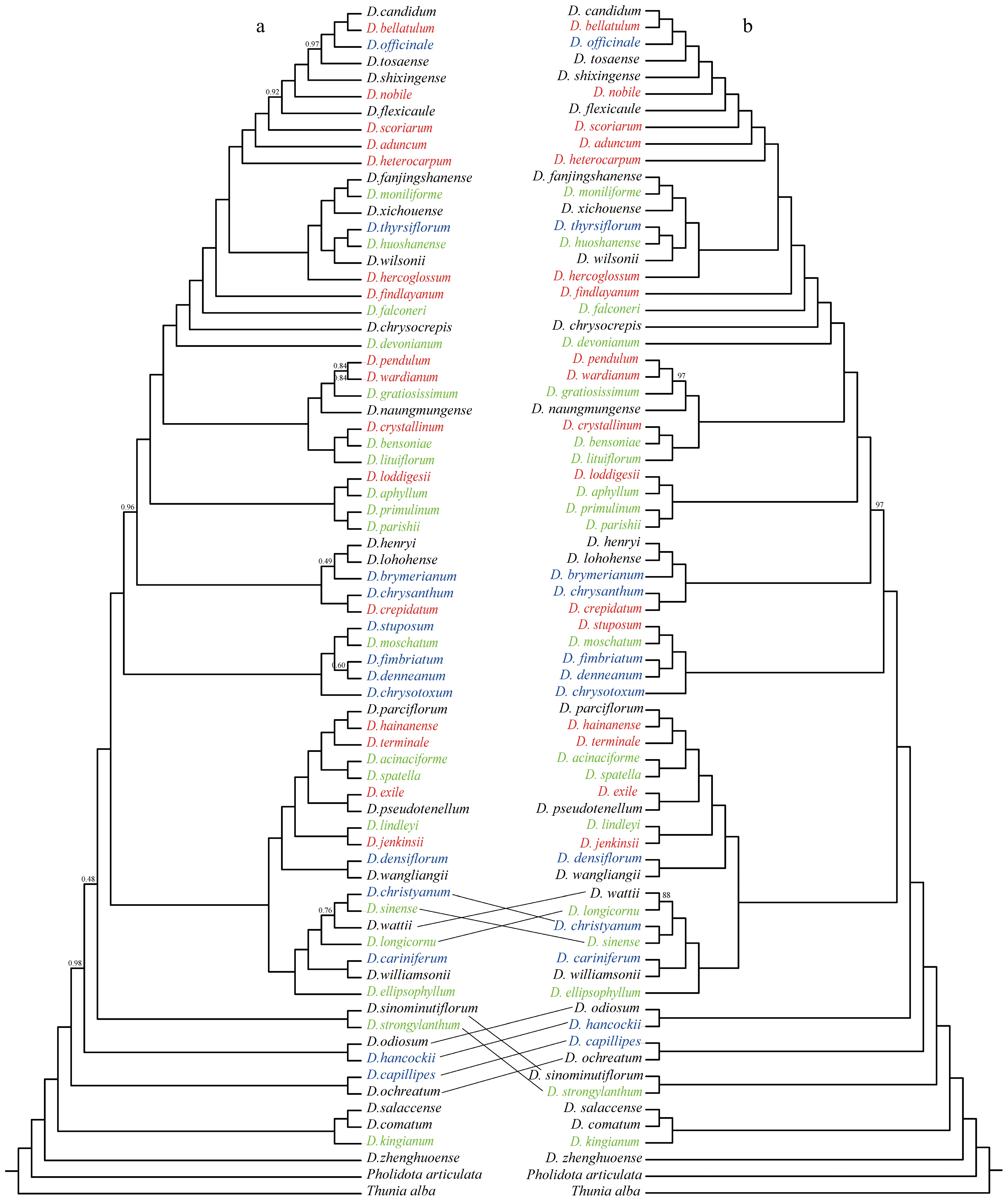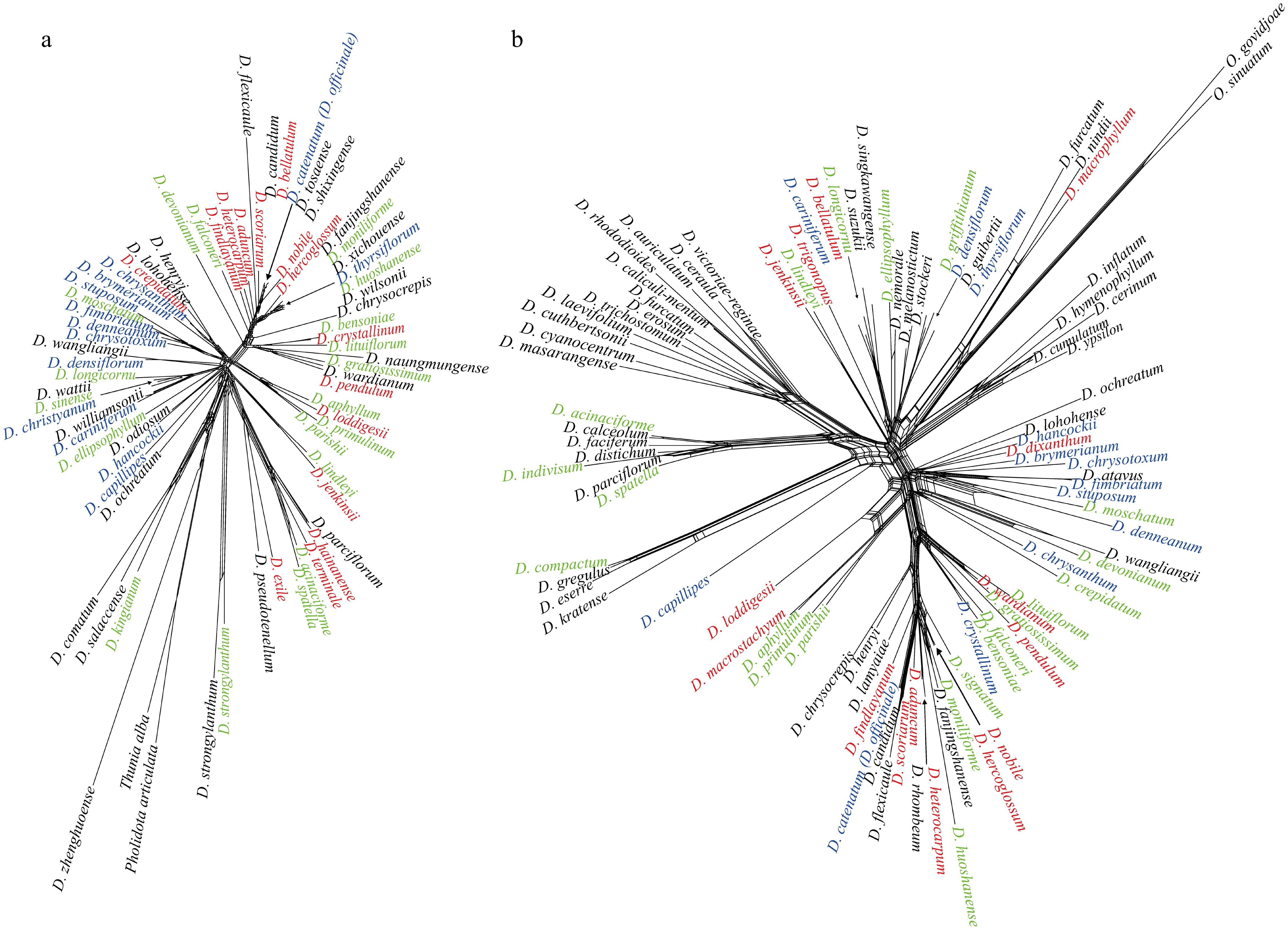 Reconstructs of the reticulate evolutionary relationships of 11 Dendrobium species. (a) Chloroplast genome data, with T. alba and P. articulata as outgroups. (b) Nuclear ITS sequences, with O. govidjoae and O. sinuatum as outgroups.