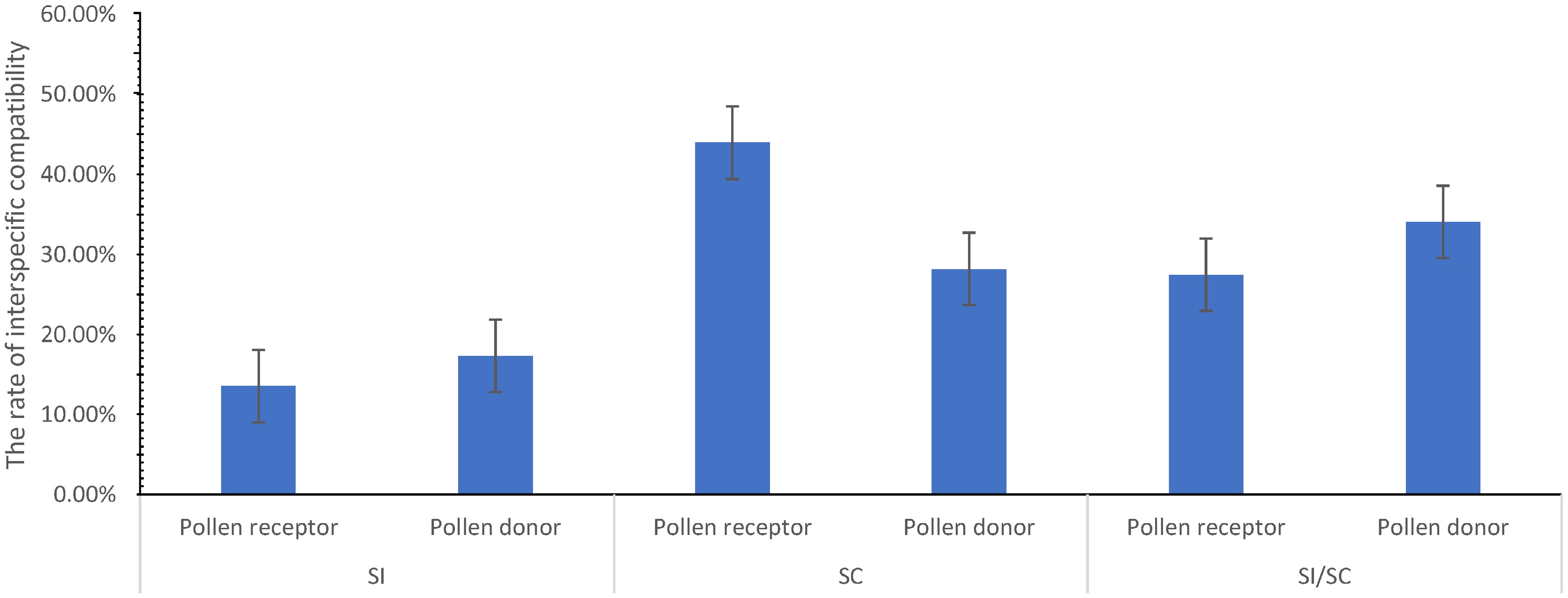 The hybridization results of 11 species with complex reticulate evolutionary relationships were compared to those of 64 species (all hybridization combinations). The hybridization results showed (Fig. 4) that the interspecific compatibility (52.50%) of species with complex reticulate evolutionary relationships was higher than that of all hybridization combinations (24.05%). Among 16 comparison results, nine comparison results (SI × SI/SC; SI as pollen donor; SI as pollen receptor; SC as pollen donor; SI/SC × SI; SI/SC × SC; SI/SC as pollen donor; SI/SC as pollen receptor; mean value) showed that the rate of interspecific compatibility between the 11 species was higher than that of the 64 species; three comparison results (SC × SI/SC; SI/SC × SI/SC; SC as pollen receptor) showed that the rate of interspecific compatibility of the 64 species was higher than that of the 11 species; and four comparison results (SI × SI; SI × SC; SC × SC; SC × SI) could not be compared due to the lack of data on hybridization combinations of the 11 species.