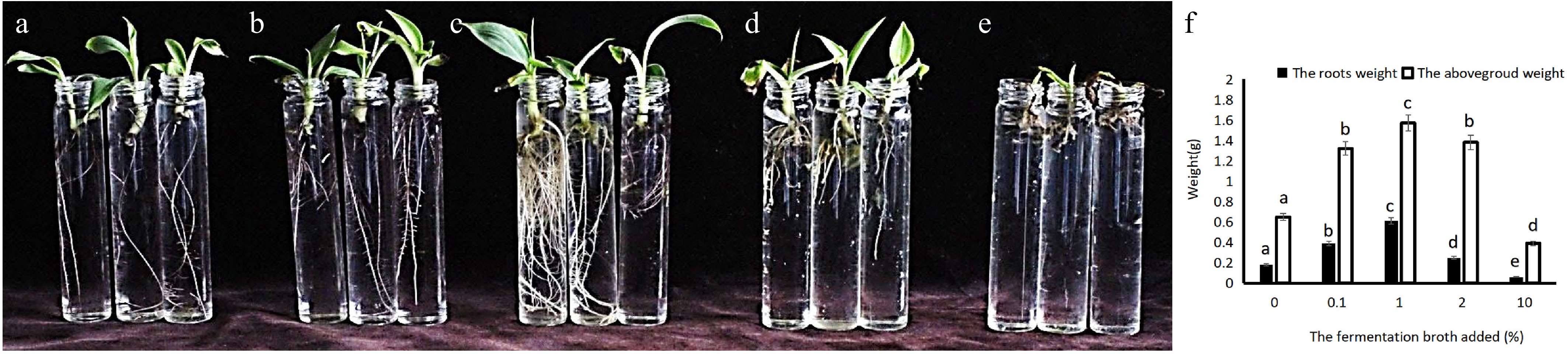 Growth effect of S. alfalfae 5406 fermentation broth on banana seedlings. (a) Soil extracts. (b) 0.1% concentration of the fermentation broth. (c) 1% of the fermentation broth. (d) 2% of the fermentation broth. (e) 10% of the fermentation broth. (f) Root and shoot weight of the banana seedlings. Different letters above the bars indicate significant differences between samples at the level of p < 0.05.