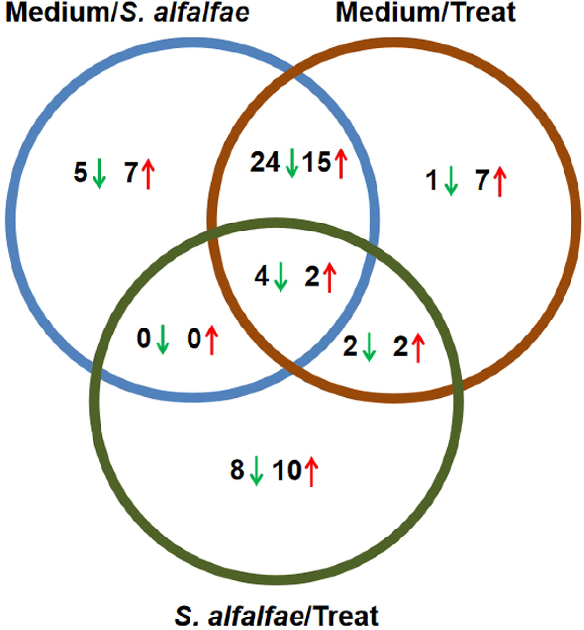 Venn diagram for differentially expressed hormone-like substances. The numbers represent differentially expressed substances identified from comparisons among the medium, S. alfalfae 5406, and the treatment group. Green arrows denote down-regulated substances, while red arrows indicate up-regulated ones.