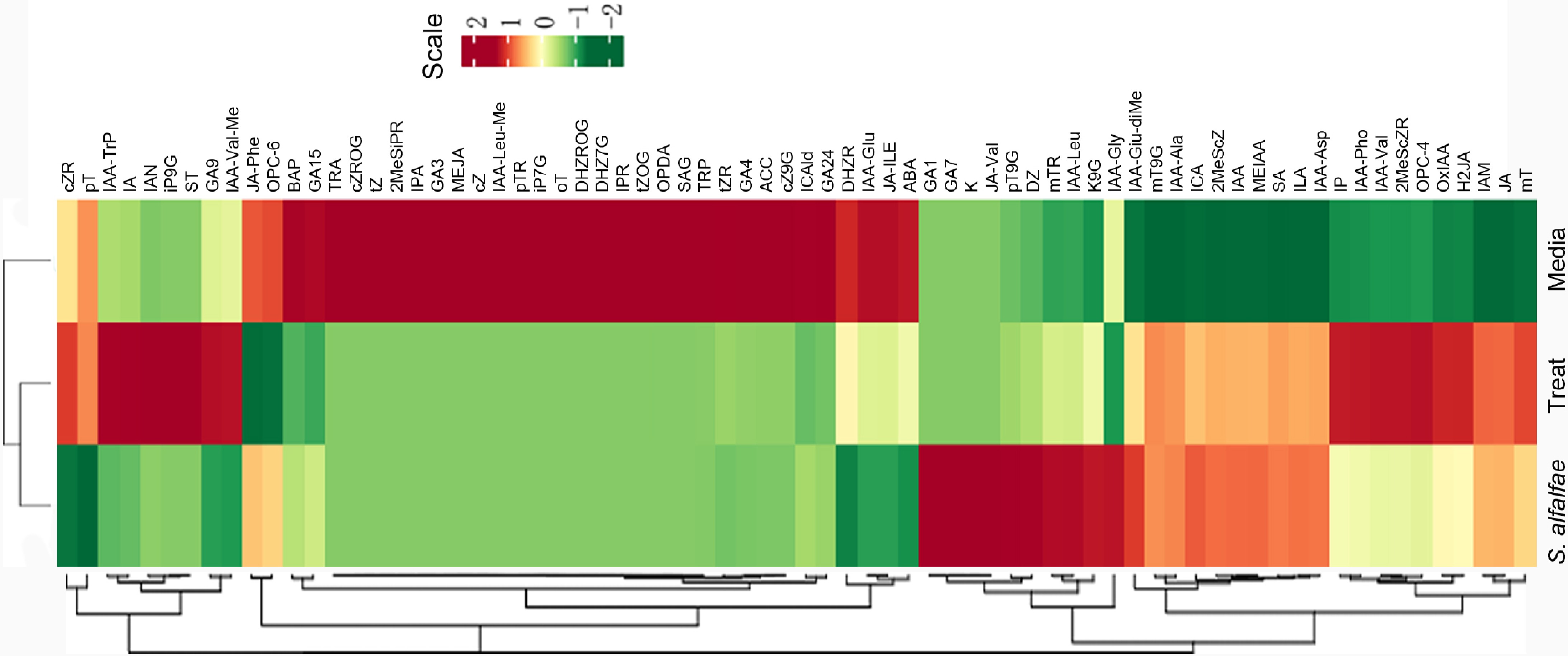 Next, cluster analysis of metabolites and samples was performed. As shown in Fig. 3, the sample from S. alfalfa 5406 and the treated group clustered together, while the media sample formed a separate cluster. The metabolite contents of JA-Phe, OPC-6, BAP, GA15, TRA, cZROG, tZ, 2MeSiPR, IPA, GA3, MEJA, cZ, IAA-Leu-Me, pTR, iP7G, oT, DHZROG, DHZ7G, IPR, tZOG, OPDA, SAG, TRP, tZR, GA4, ACC, cZ9G, ICAld, GA24, DHZR, IAA-GI, JA-ILE, and ABA were high in the media but very low in strain 5406 and the treated samples. This suggests that these metabolites were either utilized by strain 5406 or absorbed by the tomato plants. Conversely, certain hormones that were not detected or present at low levels in the media were found at high levels in strain 5406 and the treated group., indicating that these metabolites were produced by the bacterial strain 5406. Additionally, some hormones were detected at high levels in strain 5406 but at low levels in the treated group, suggesting that these metabolites were synthesized by the strain but utilized by the tomato plants.