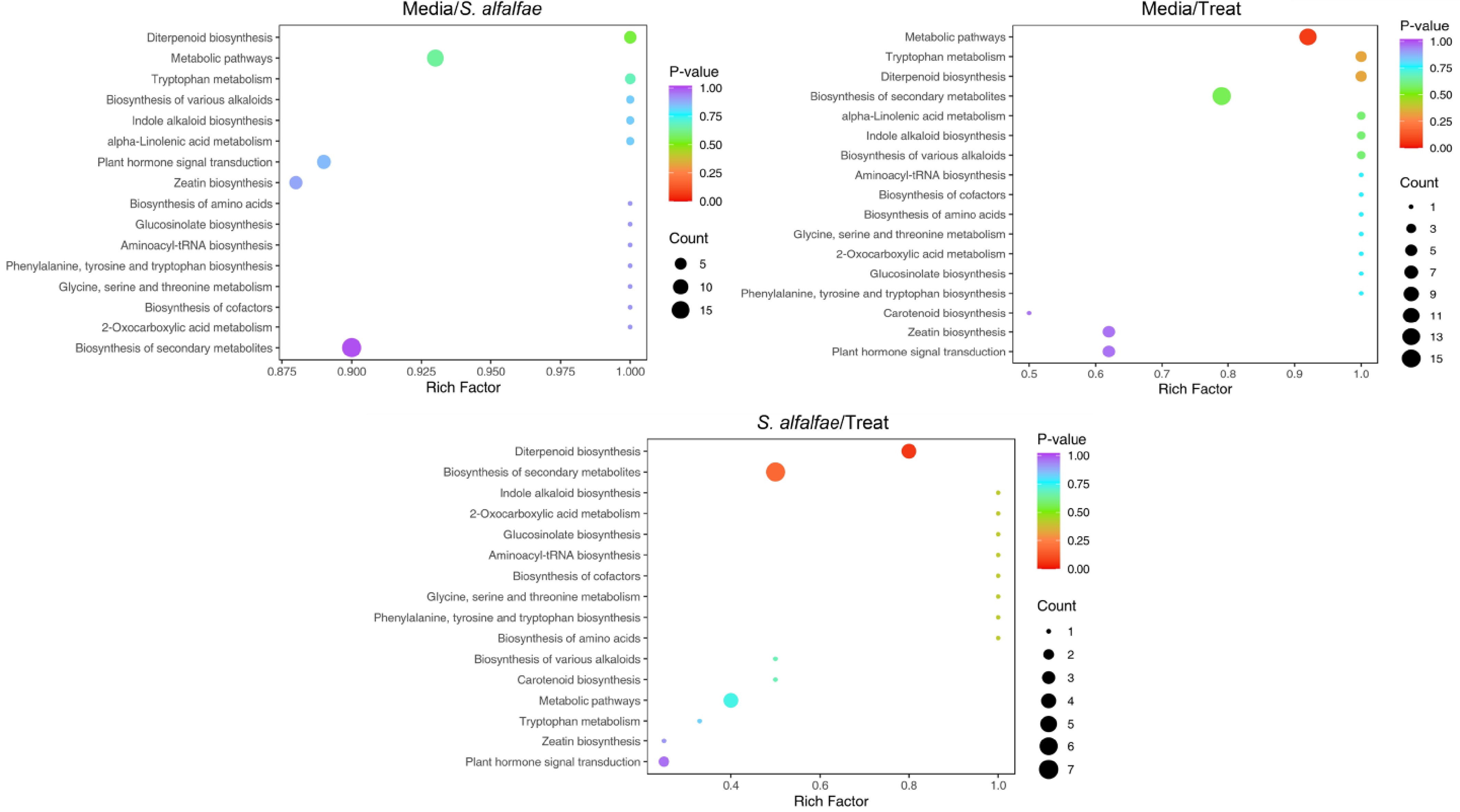 Based on KEGG enrichment analysis of the differential metabolites between samples (Fig. 4), in the comparison between S. alfalfa 5406 broth and the treated group, the most significantly enriched pathway was the biosynthesis of secondary metabolites, followed by the general metabolic pathway and then the plant hormone signal transduction pathway. Overall, very similar enrichment patterns of differential metabolites were observed between the media vs strain 5406 and media vs treated groups. This suggests that the metabolite profiles of strain 5406 and the treated samples were quite similar.