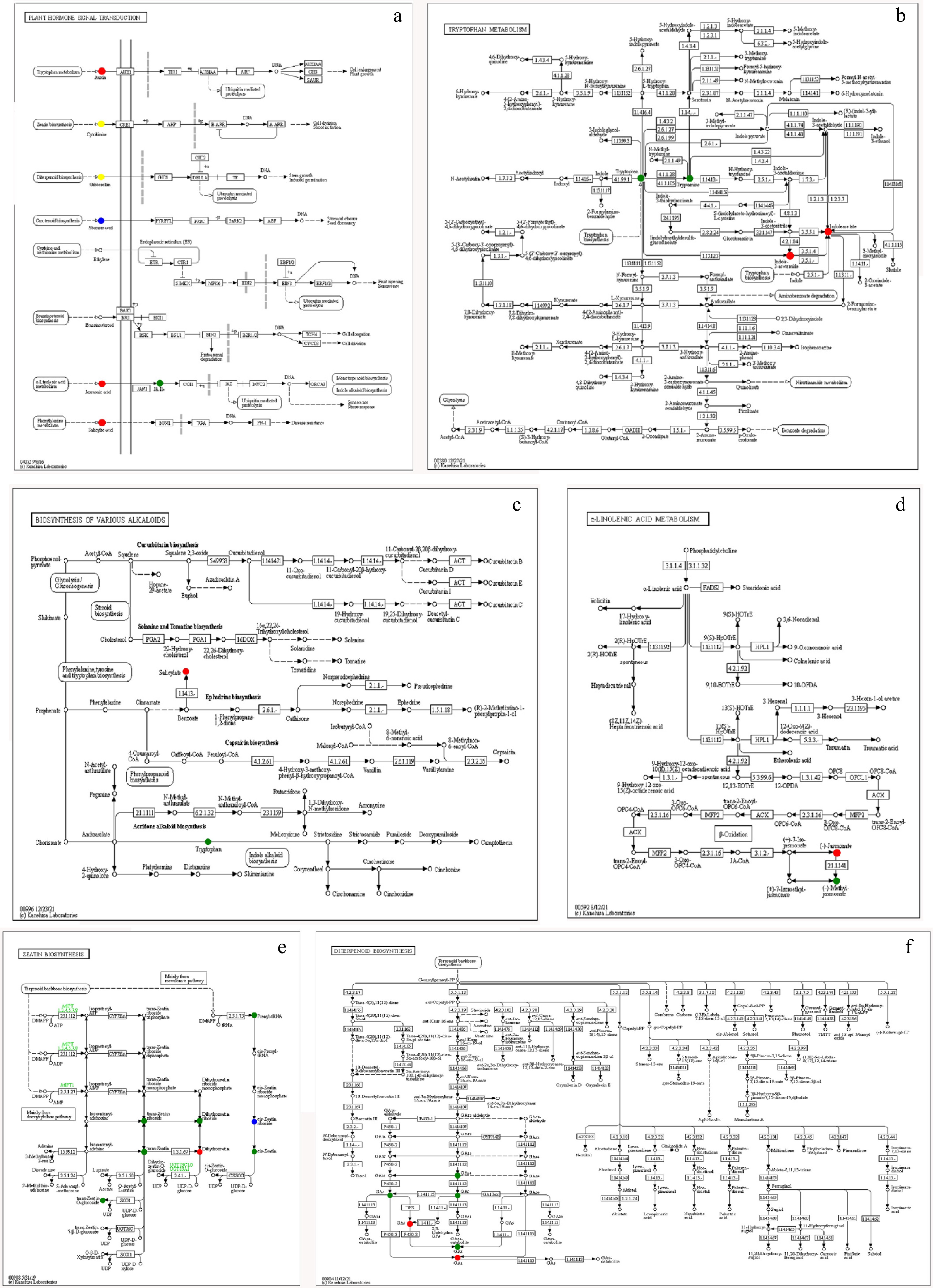 Metabolite KEGG pathway map of metabolites differentially detected in medium vs S. alfalfae 5406 treatments. Significantly affected pathways include biosynthesis of (a) secondary metabolites, (b) tryptophan metabolism, (c) biosynthesis of various alkaloids, (d) α-linolenic acid metabolism, (e) zeatin biosynthesis, and (f) diterpenoid biosynthesis. Red indicates metabolites that were significantly up-regulated in the S. alfalfae 5406 sample; blue indicates metabolites that were detected but not significantly changed; and green indicates significantly down-regulated metabolites in the S. alfalfae sample.