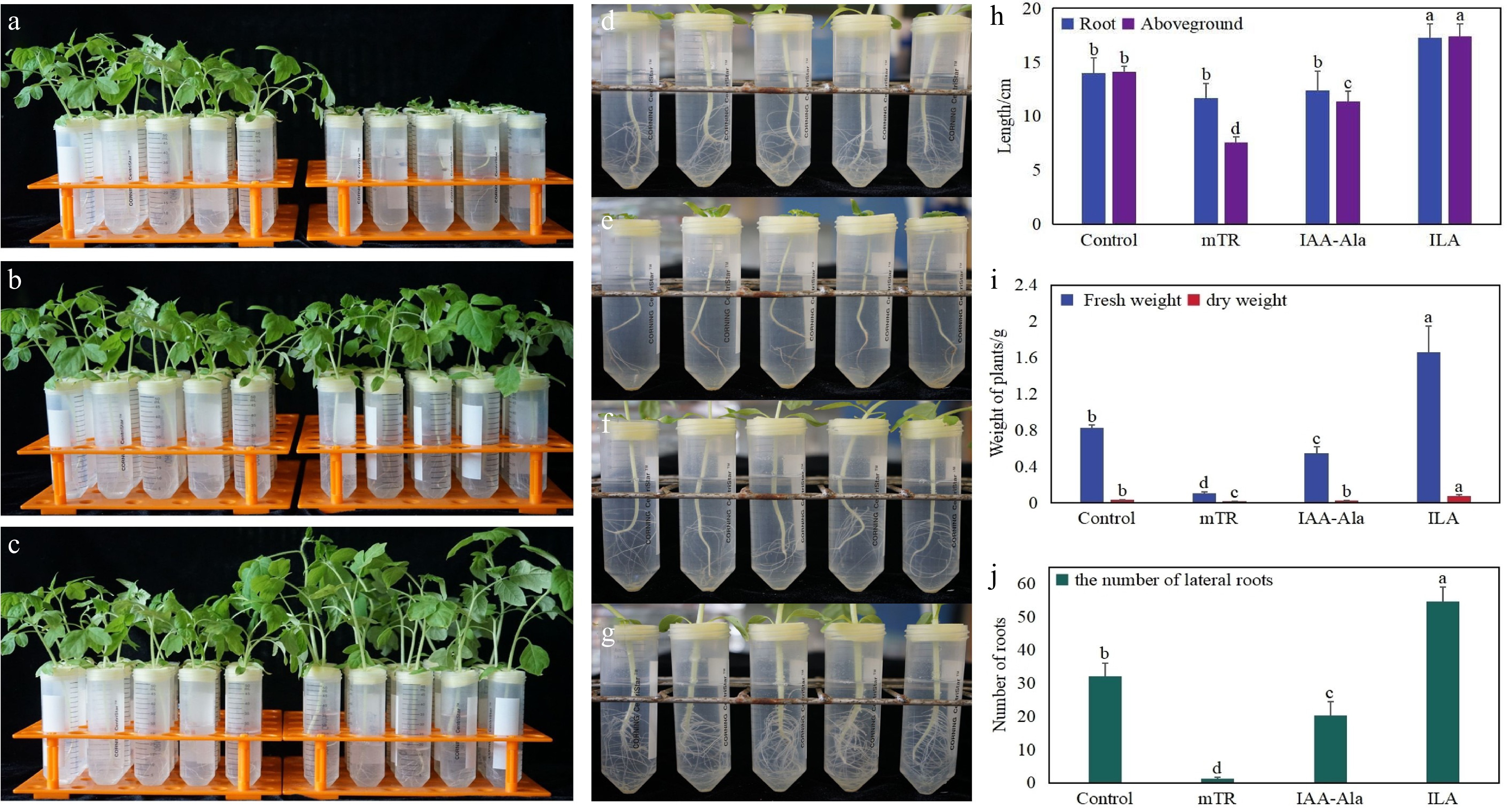Effect of three candidate metabolites on the growth of tomato seedlings. (a) Growth of seedlings treated with culture medium (left) and mTR (right). (b) Growth of seedlings treated with culture medium (left) and IAA-Ala (right). (c) Growth of seedlings treated with culture medium (left) and ILA (right). (d) Growth of roots in culture medium. (e) Growth of roots treated with mTR. (f) Growth of roots treated with IAA-Ala. (g) Growth of roots treated with ILA. (h) Statistical analysis of root length and shoot weight. (i) Statistical analysis of fresh weight and dry weight. (j) Statistical analysis of lateral root number. Different letters in the figure indicate significant differences between treatments at p < 0.05.