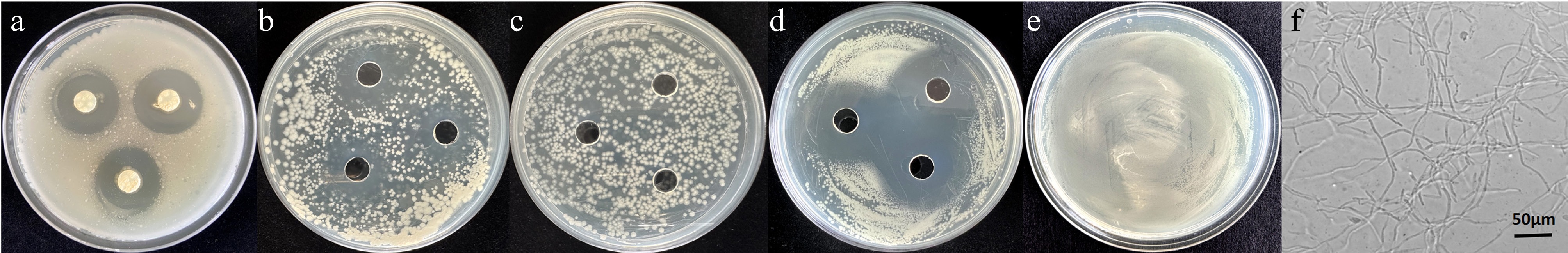 Antibacterial effects of S. alfalfae 5406 and salicylic acid against R. solanacearum. (a) S. alfalfae 5406 mycelial discs placed on LB agar inoculated with R. solanacearum. (b) Sterile supernatant of S. alfalfae 5406 added to wells in LB agar inoculated with R. solanacearum. (c) Control of R. solanacearum with PBS broth added to the wells. (d) SA added to wells in LB agar with R. solanacearum. (e) Control of R. solanacearum only, without additives. (f) Microscopic morphology of S. alfalfae 5406.
