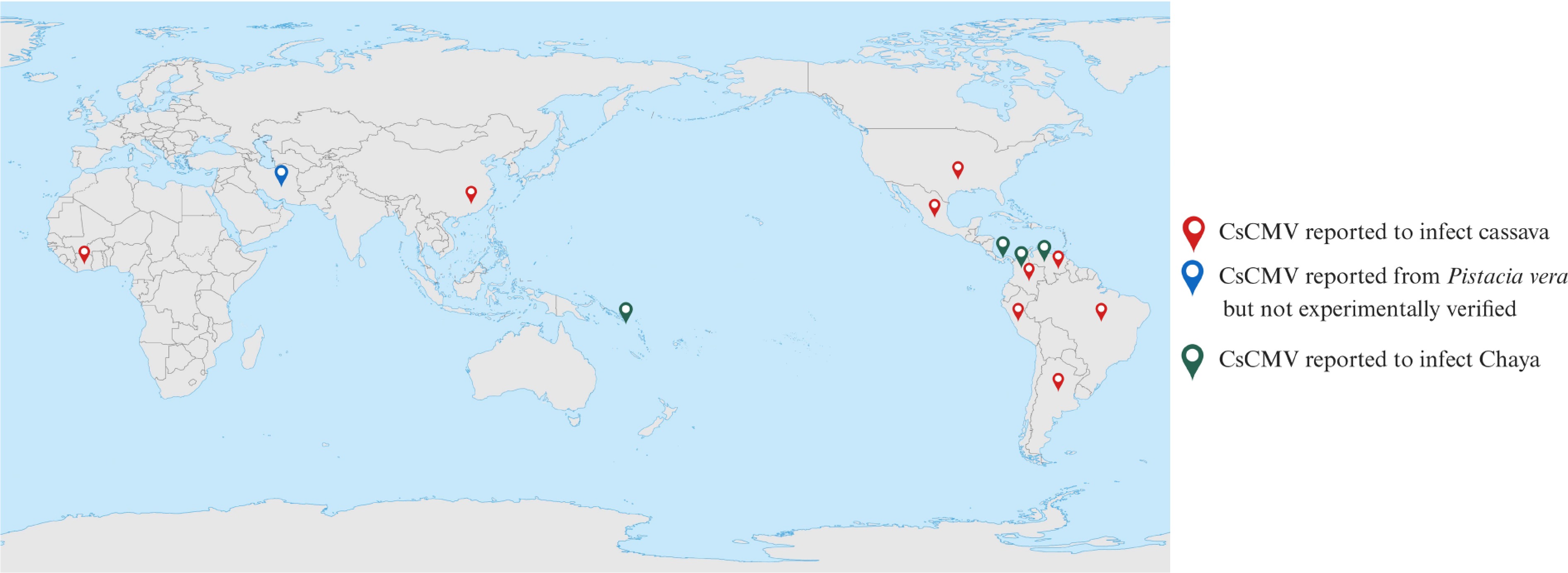 Geographical distribution of cassava common mosaic virus (CsCMV). CsCMV viral genomes were reported mainly from Latin America and Asia in countries such as Brazil, Argentina, Venezuela, Colombia, Paraguay, Peru, and China. In addition, CsCMV was reported in Côte d'Ivoire and Tuvalu. CsCMV has also been identified in chaya (Cnidoscolus chayamansa or Cnidoscolus aconitifolius) in Mexico, Venezuela, Tuvalu, Florida, Costa Rica, and Colombia.