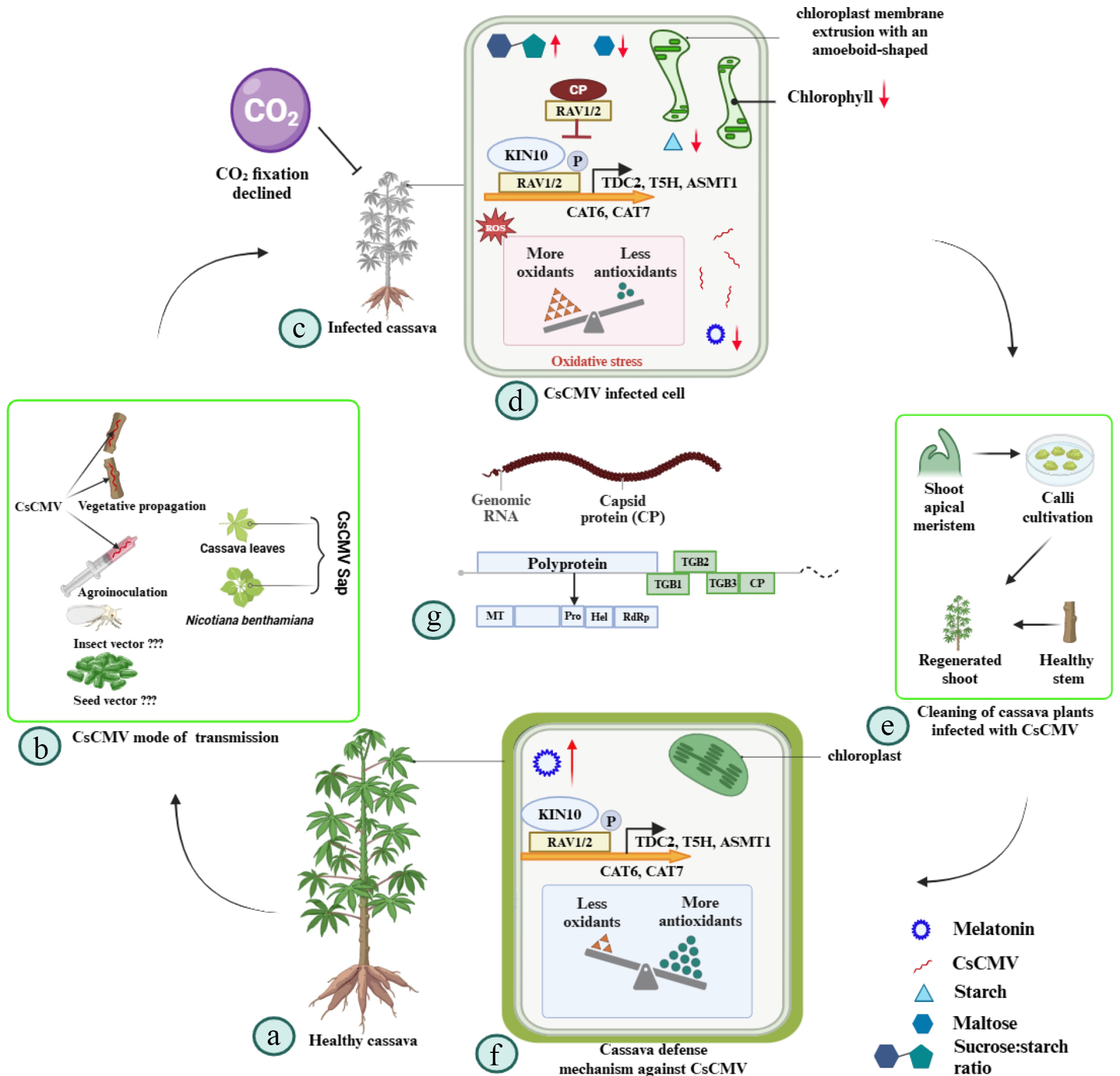 Advances in research into cassava common mosaic virus (CsCMV). (a) Healthy cassava. (b) Mode of transmission. (c) Infected cassava. (d) Infected cell. (e) Cleaning of cassava-infected plants. (f) Defense mechanism. (g) Genome organization of Potexvirus. RNA-dependent RNA polymerase (RdRp); triple gene block (TGB); coat protein (CP); helicase (Hel); methyltransferase (MT). CsCMV can be transmitted through agroinoculation, vegetative propagation, and sapping, although no seed or insect transmission vectors have been identified. Cassava infected with CsCMV exhibits various physiological effects, including chloroplast membrane extrusion with ameboid-like shapes, oxidative stress, reduced CO2 fixation, and diminished chlorophyll levels, negatively impacting photosynthesis. Additionally, infections lead to decreased maltose and starch content in the plant. Melatonin positively regulates cassava's resistance to CsCMV. CsCMV infections can be addressed by isolating and regenerating the shoots' apical meristem. Furthermore, only healthy plants or stems should be used for vegetative propagation. The cutting tools should be regularly disinfected to minimize the risk of transmission.