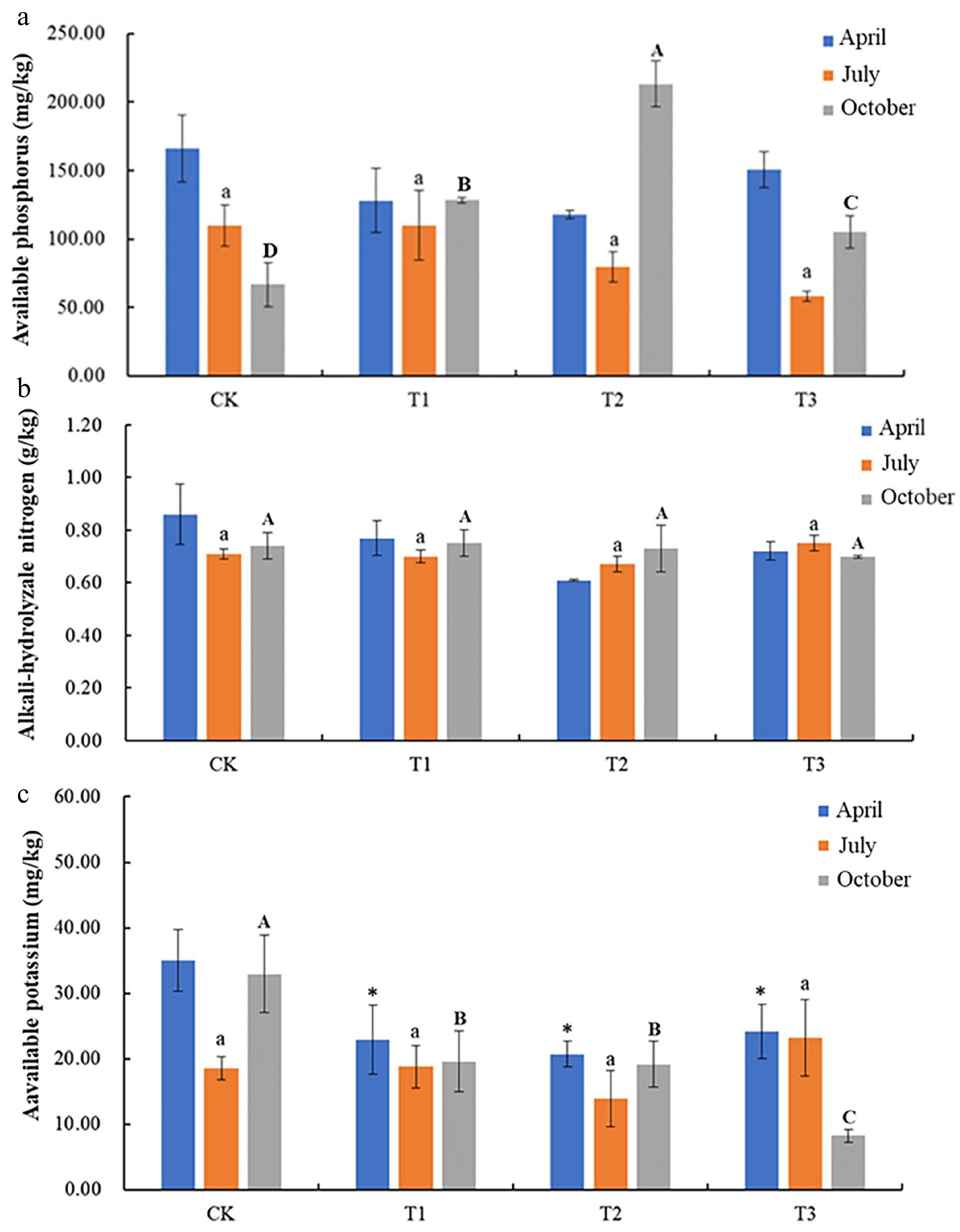 Changes in soil contents of (a) AP, (b) alkali-hydrolyzable nitrogen, and (c) available K, under intercropping of peanut, stylosanthes, and hyacinth bean. Error bar represents standard deviation (SD). According to Duncan test, '*' represents soil available potassium content of different treatment in April has significant differences (p < 0.05); different lowercase letters represent soil available potassium content of different treatment in July has significant differences (p < 0.05); different capital letters represent soil available potassium content of different treatment in October has significant differences (p < 0.05).