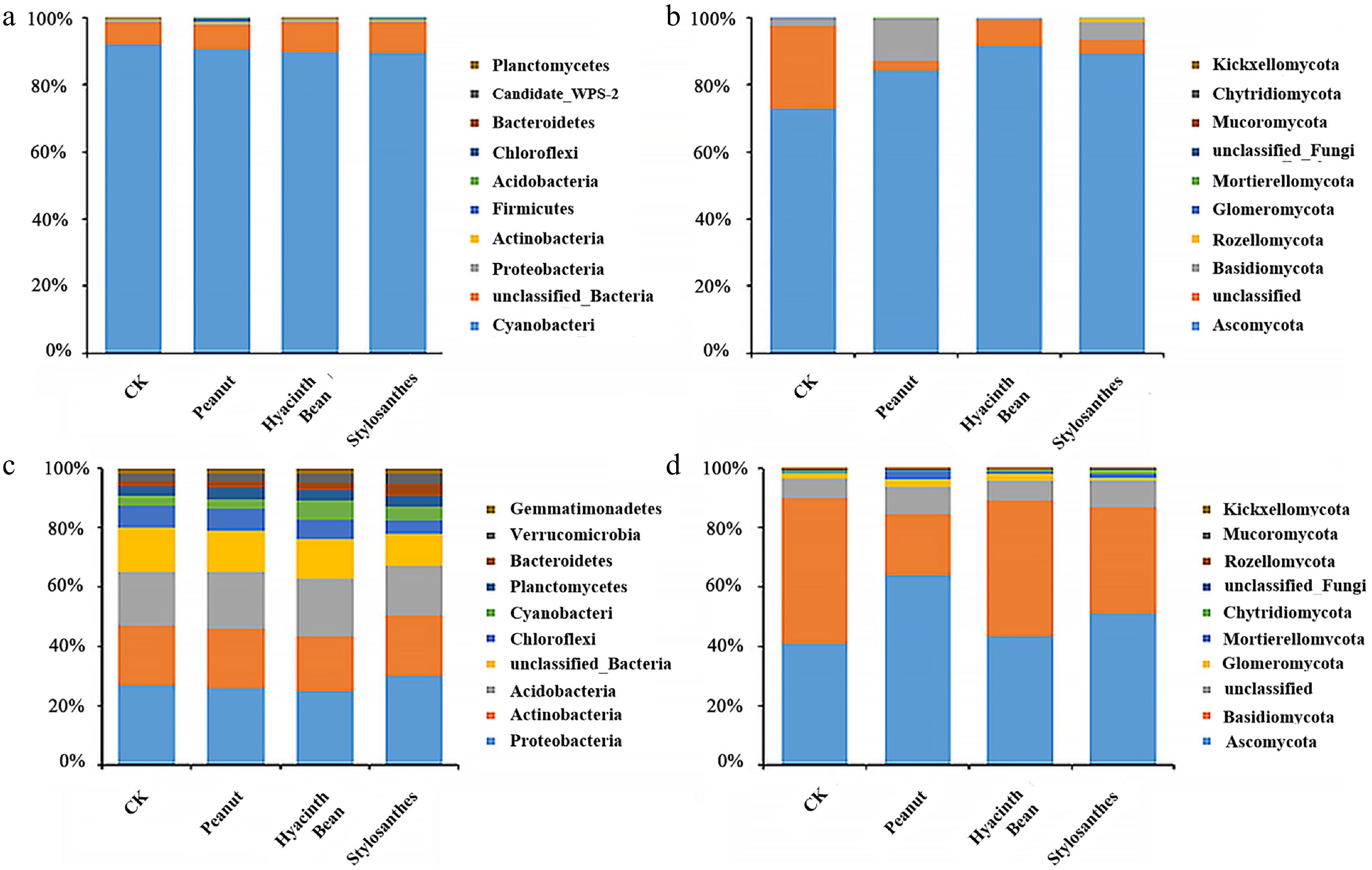 In the rhizosphere soil, clear dominant bacteria were found. The abundances of Actinobacteria, Acidobacteria, and Proteobacteria were high compared with those in the rhizosphere soil samples, accounting for 17.42%–19.57%, 16.16%–18.57% and 23.87%–28.79%, respectively, as shown in Fig. 3. However, among the dominant rhizosphere bacteria, few bacteria showed significant changes compared with controls. Ascomycota and Basidiomycota were the dominant phylum in the rhizosphere. Interestingly, fungi Ascomycota showed increase after planting with legumes, while Basidiomycota showed a downward trend, compared with monoculture.