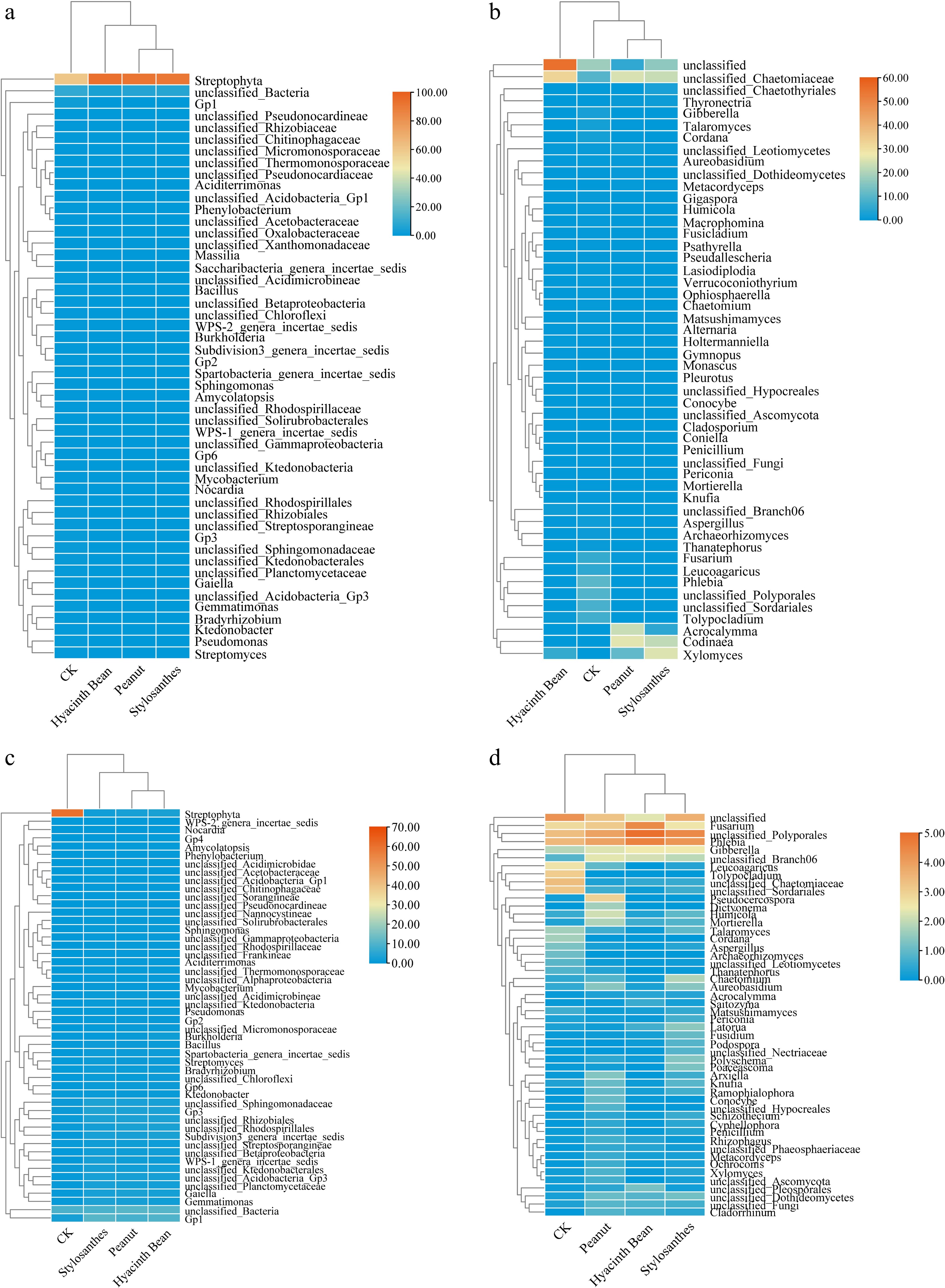 Heatmap of the relative abundances at the genus level of the top 50 bacterial communities in the tubers and the rhizosphere soil of different intercropping treatments. (a) Bacterial communities in tubers. (b) Fungal communities in tubers. (c) Bacterial communities in the rhizosphere soil. (d) Fungal communities in the rhizosphere soil.