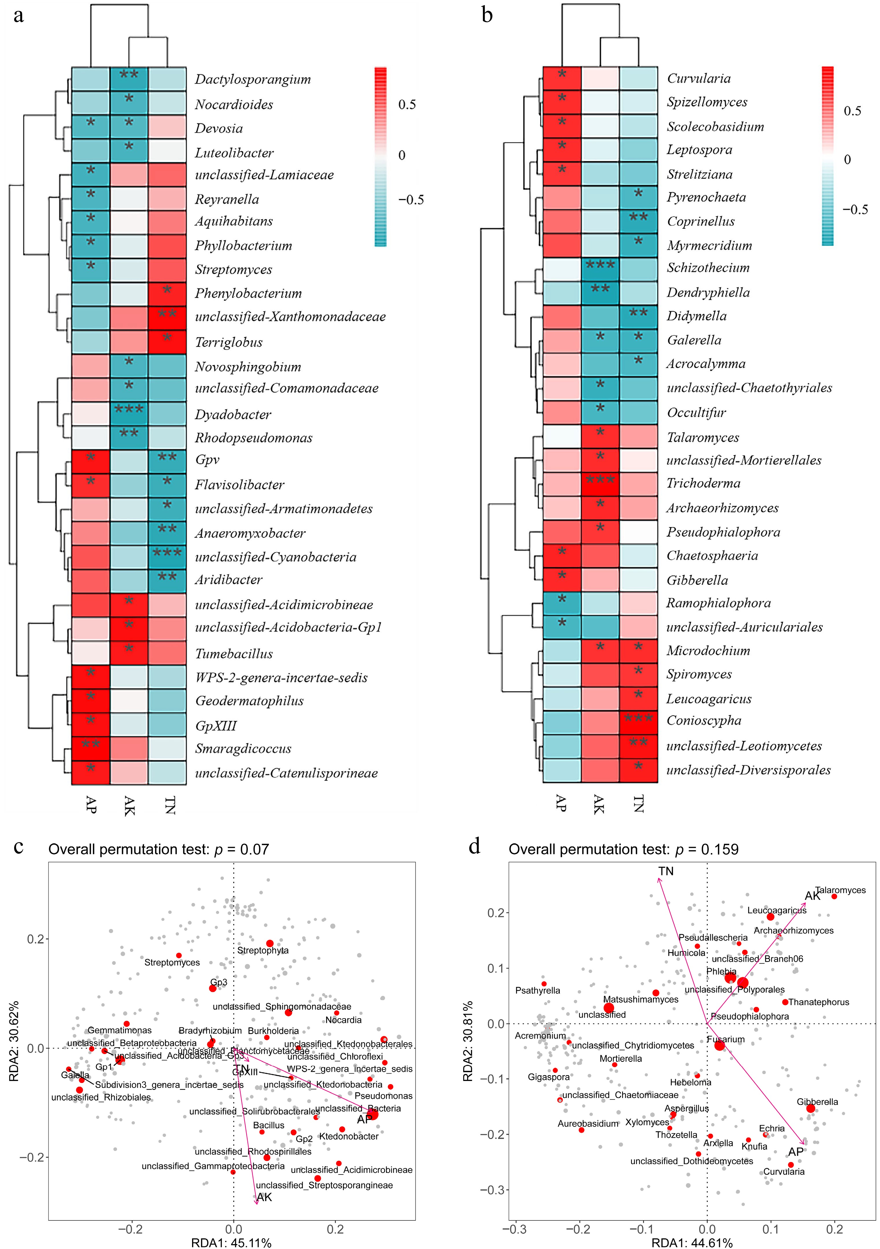 Correlation analysis. (a) Bacterial communities in the rhizosphere soil. (b) Fungal communities in the rhizosphere soil and RDA redundancy analysis. (c) Bacterial communities in the rhizosphere soil. (d) Fungal communities in the rhizosphere soil of rhizosphere microorganisms and rhizosphere soil fertility in cassava after intercropping with different legumes. Asterisks indicate significant differences in correlation (ANOVA, FDR-corrected LSMeans, *, p < 0.05; **, p < 0.01; ***, p < 0.001).
