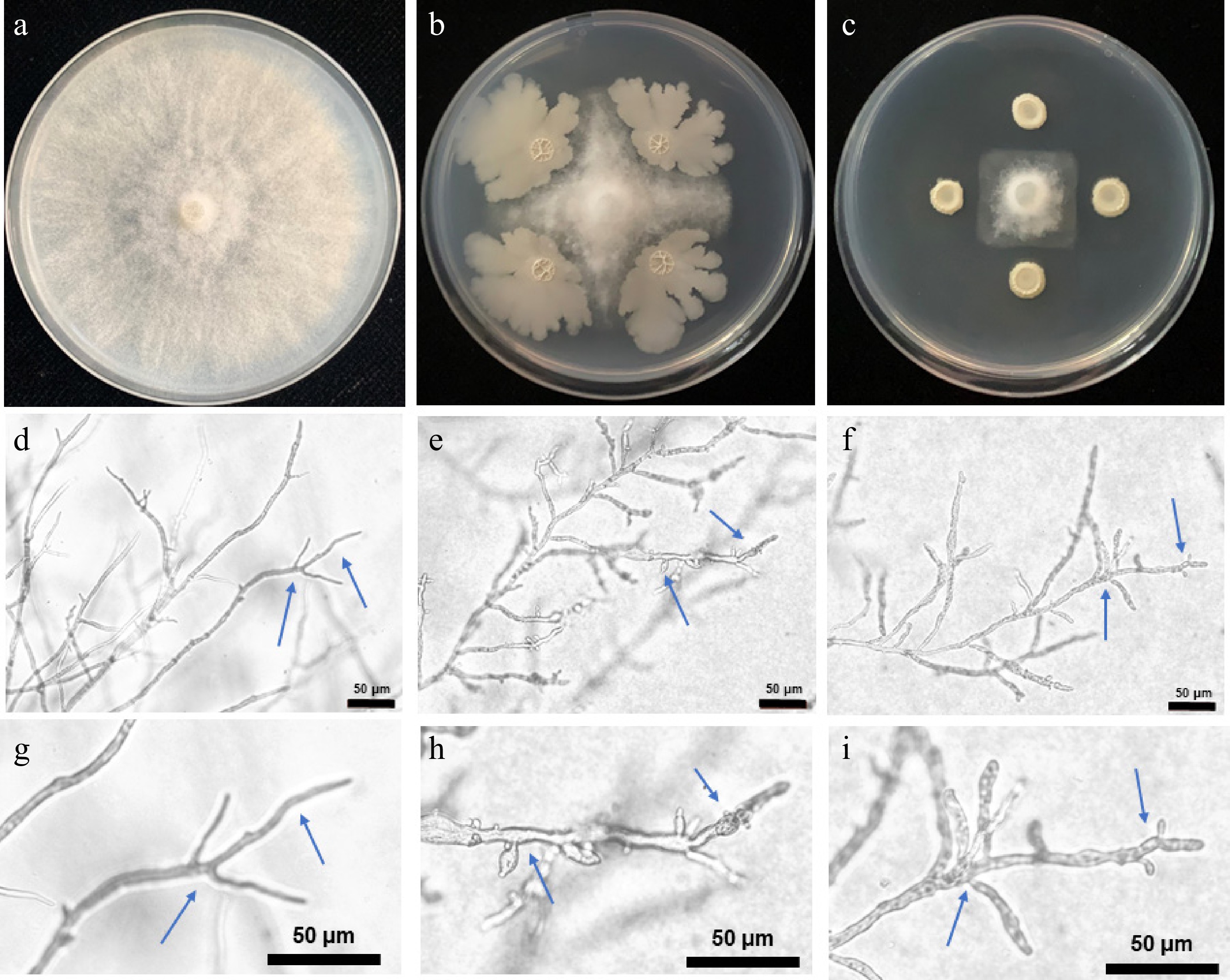 Inhibition effect of the isolated strains against P. capsici in the dual cultures and the mycelial morphology. (a), (d), and (g): Control (SDW); (b), (e), and (h): H12 treatment; (c): H23 treatment. Pictures were recorded on the day when radial growth of the control treatment was middle (d)–(i), and full (a)–(c) of plate. The blue arrows indicate the different forms of hyphae.