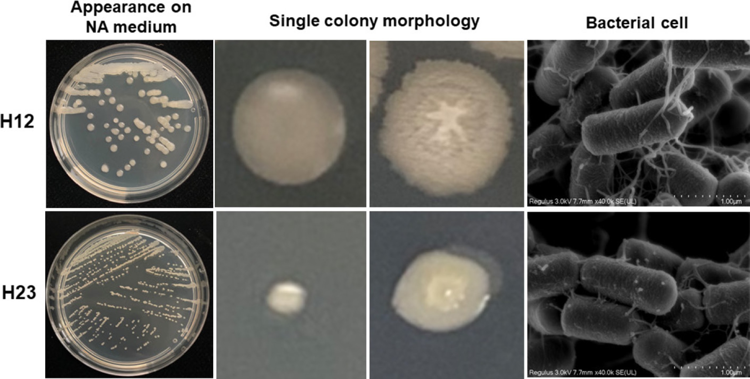 Colony morphological characteristics of H12 and H23. From left to right are appearance on NA medium at 18 h. Single colony morphology at 18 and 24 h, scanning electron micrographs of bacterial cells.