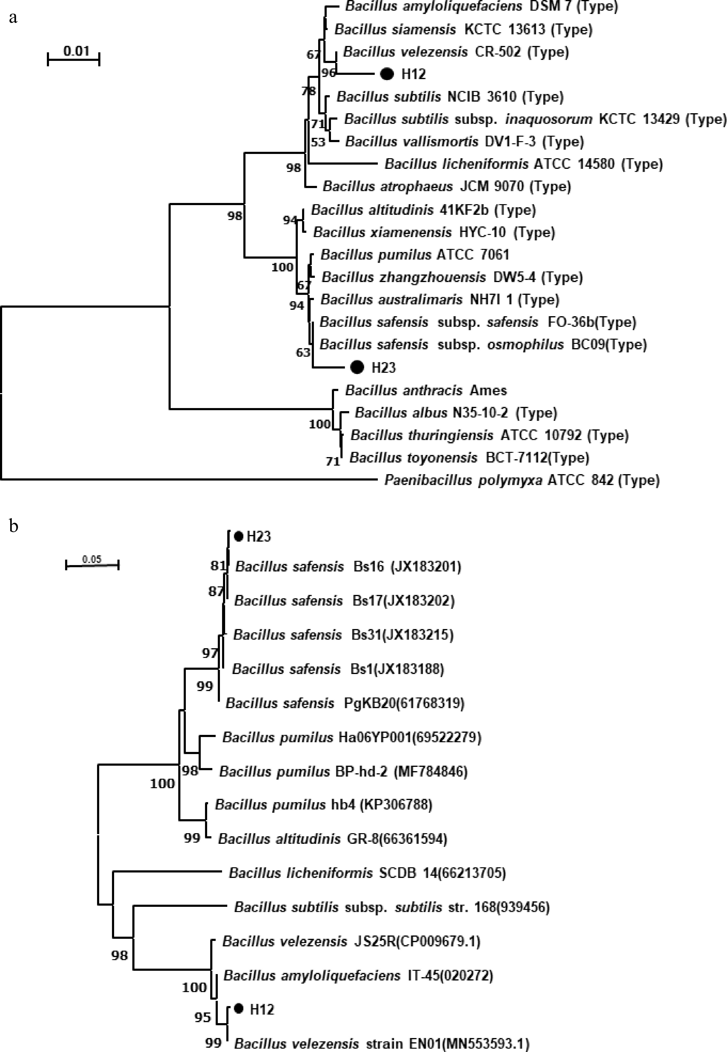 The 16S rRNA gene fragments were amplified from the total DNA isolates of H12 and H23 and sequenced, yielding sequences of 1,452 bp for both isolates. Based on BLAST analysis against the NCBI database, both H12 and H23 were found to be phylogenetically affiliated with members of the genus Bacillus. Strain H12 shared 99.79% and 99.93% 16S rRNA gene sequence identity with B. amyloliquefaciens and B. velezensis, respectively. Strain H23 was identical (100%) to B. safensis and shared 99.93% identity with B. pumilus. The NJ phylogenetic tree showed that strain H12 formed a cluster closely related to B. velezensis, and H23 formed a cluster closely related to B. safensis (Fig. 3a).