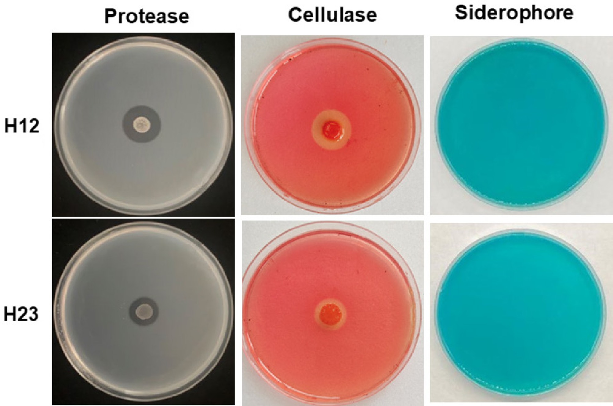The extracellular enzymatic activity of strains H12 and H23, where there were proteases, cellulases, and iron carriers from left to right.