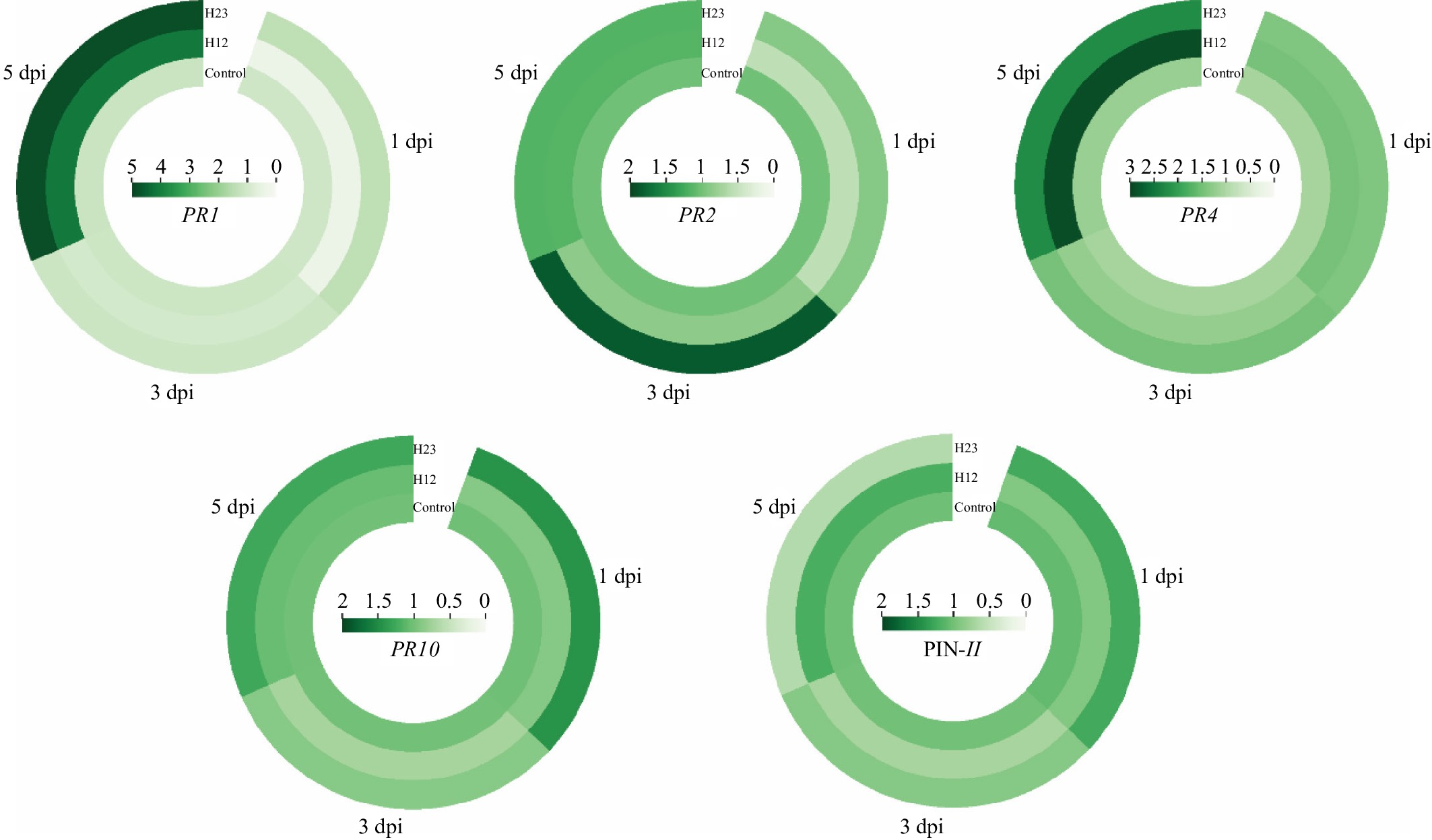 Expression of PR1, PR2, PR4, PR10, and PIN-II in pepper at 1 d, 3 d, and 5 d after inoculation with P. capsici under H12 and H23 pre-treatment. The circular cluster plot of different colors based on the data range (displayed in the middle of each circle) showed the variations in each treatment.