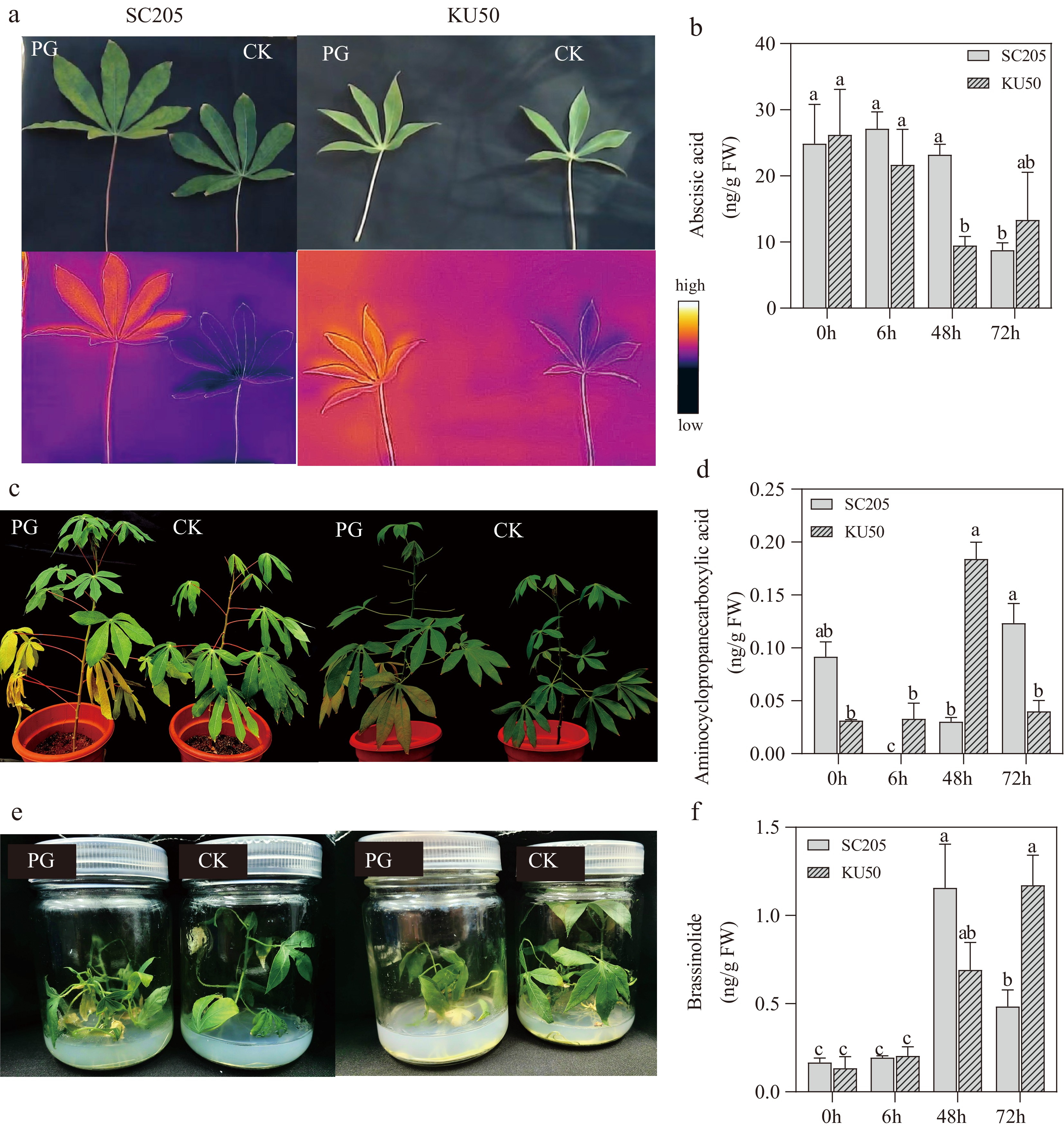 Phenotypic changes in cassava under high-temperature treatment. (a) Infrared leaf temperature comparison between SC205 and KU50 under control (CK) and heat treatments (PG). (b) ABA content changes in SC205 and KU50 under high-temperature stress. (c) Phenotypic alterations of potted seedlings (control vs 72 h heat treatment) in SC205 and KU50. (d) ACC content changes in SC205 and KU50 under high-temperature stress. (e) Phenotypic alterations of tissue-cultured seedlings (control vs 72 h heat treatment) in SC205 and KU50. (f) BR content changes in SC205 and KU50 under high-temperature stress. Different lowercase letters indicate significant differences at p ≤ 0.05.