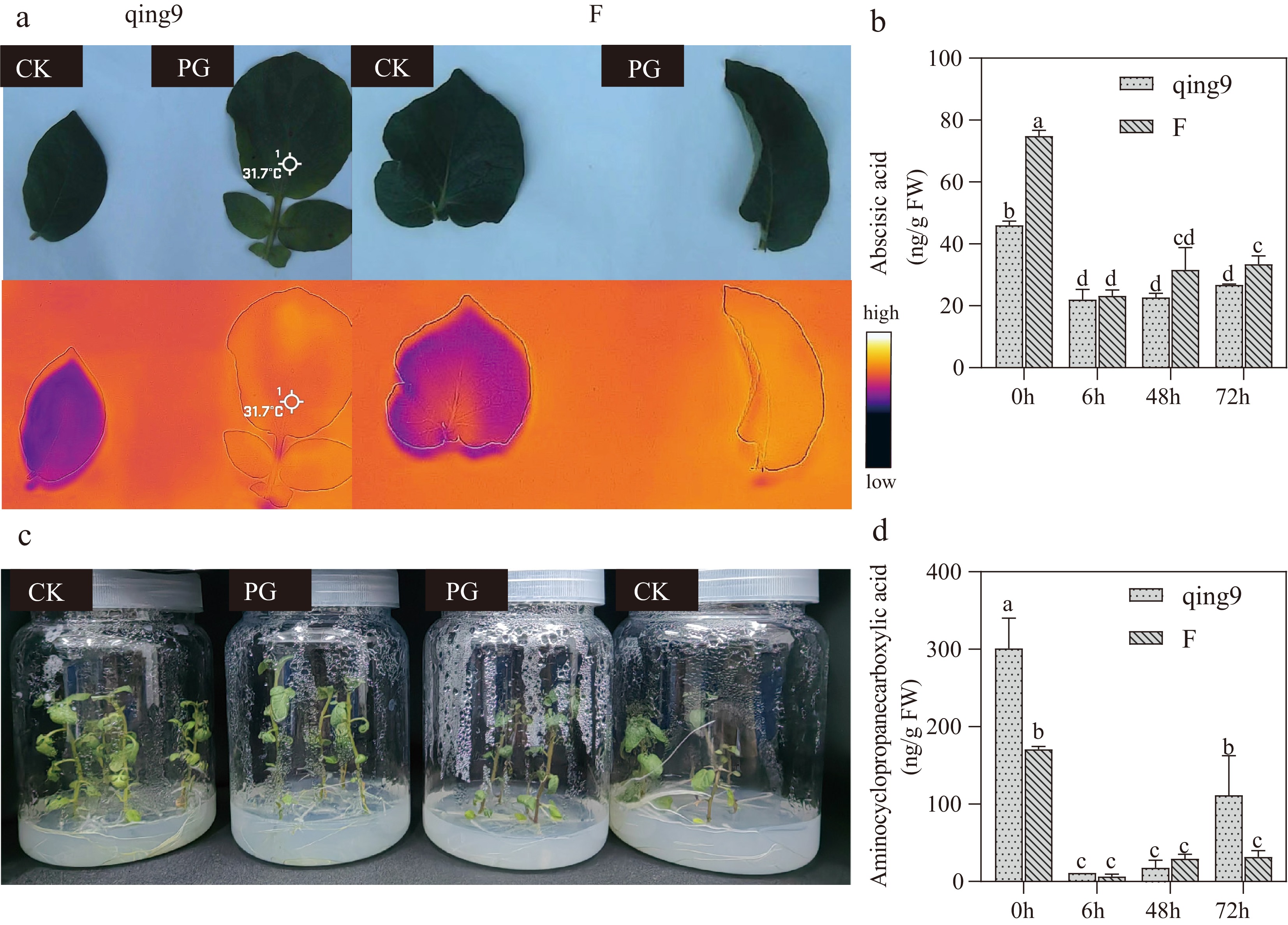 Phenotypic changes in potato under high-temperature treatment. (a) Infrared leaf temperature comparison between Qingshu No. 9 and FAVORITA under control (CK) and heat treatments (PG). (b) ABA content changes in Qingshu No. 9 and FAVORITA under high-temperature stress. (c) Phenotypic alterations of tissue-cultured seedlings (control vs 72 h heat treatment) in Qingshu No. 9 and FAVORITA. (d) ACC content changes in Qingshu No. 9 and FAVORITA under high-temperature stress. Different lowercase letters indicate significant differences at p ≤ 0.05.