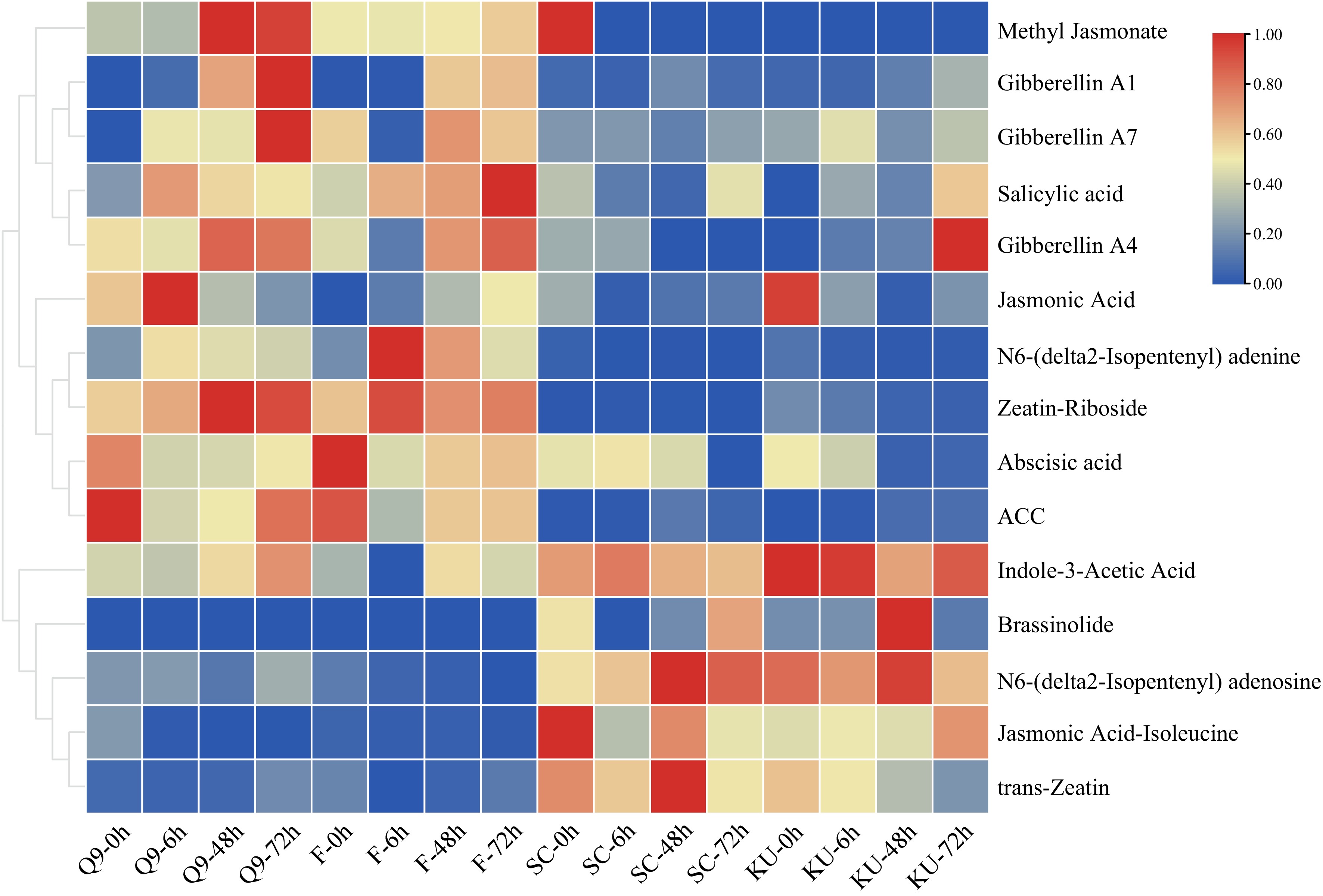 Heatmap of hormone content changes in potato and cassava under high-temperature treatment. qing9 denotes Qingshu No. 9, F denotes FAVORITA, SC denotes cassava SC205, and KU denotes cassava KU50.