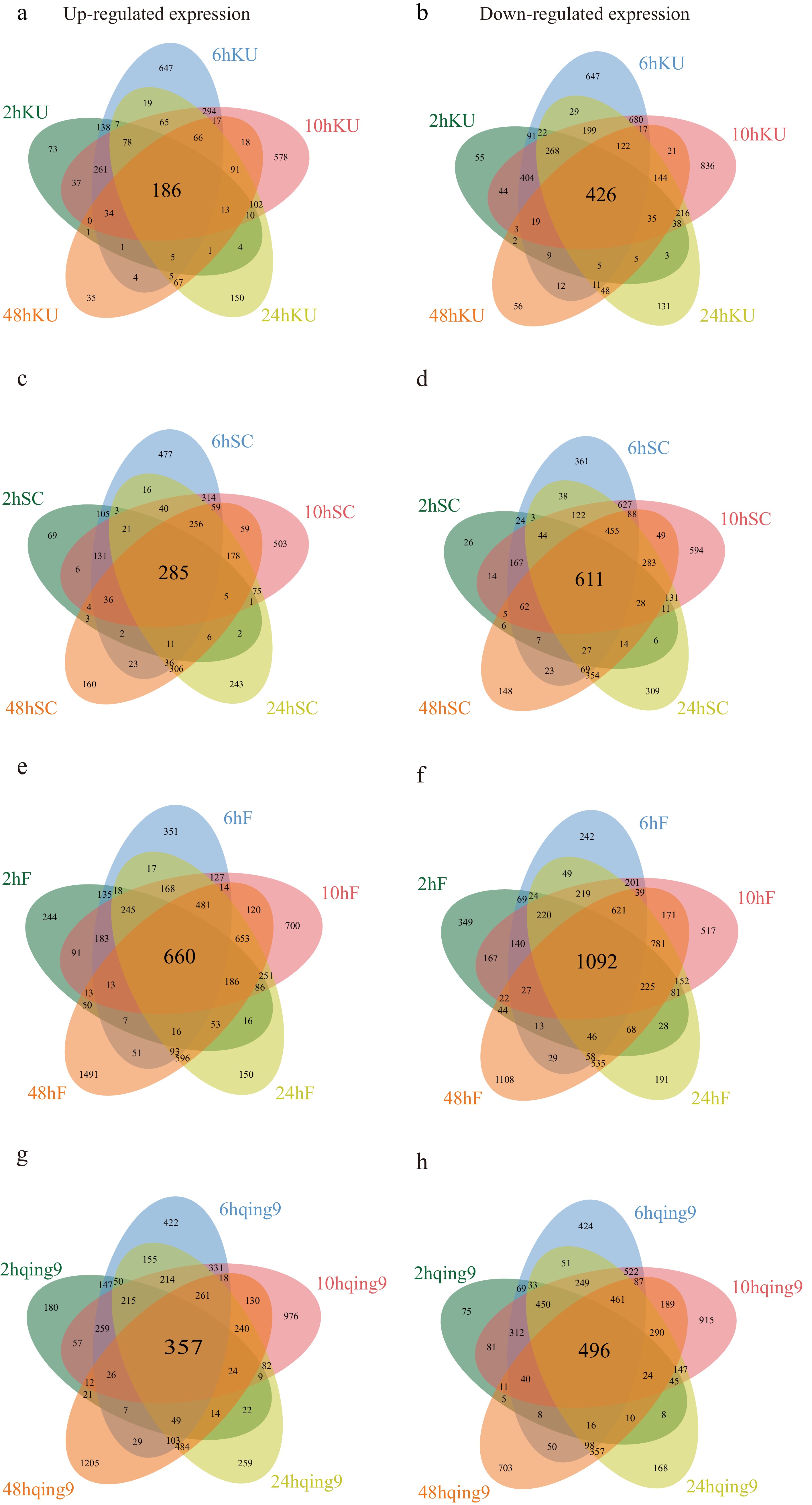 Venn diagrams of differentially expressed genes (DEGs) in cassava and potato under heat treatment. (a) Venn diagram of up-regulated DEGs in KU50 (heat vs control). (b) Venn diagram of down-regulated DEGs in KU50 (heat vs control). (c) Venn diagram of up-regulated DEGs in SC205 (heat vs control). (d) Venn diagram of down-regulated DEGs in SC205 (heat vs control). (e) Venn diagram of up-regulated DEGs in FAVORITA (heat vs control). (f) Venn diagram of down-regulated DEGs in FAVORITA (heat vs control). (g) Venn diagram of up-regulated DEGs in Qingshu No. 9 (heat vs control). (h) Venn diagram of down-regulated DEGs in Qingshu No. 9 (heat vs control).