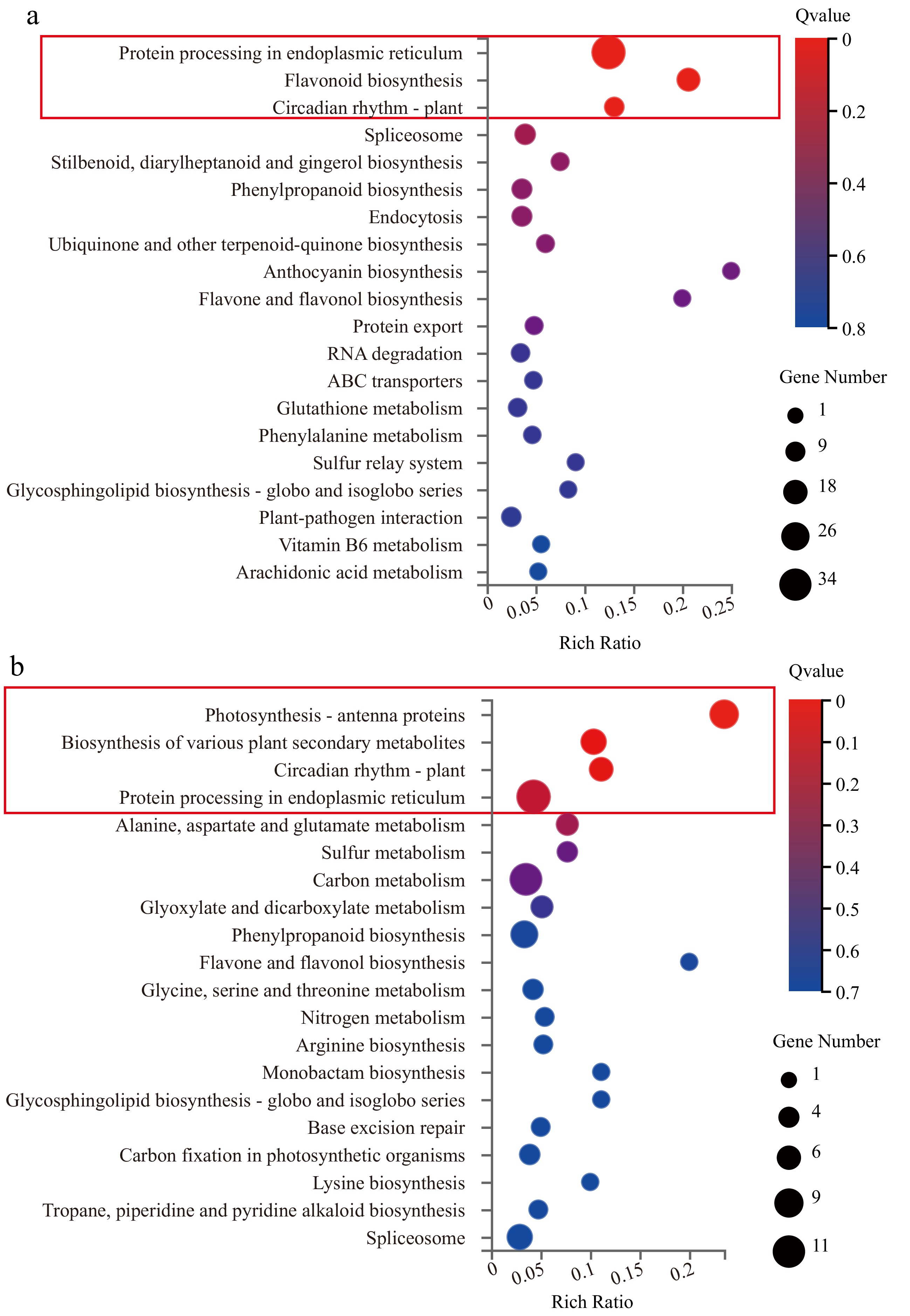 Comparison of enriched KEGG metabolic pathways between cassava and potato. (a) KEGG enrichment of consistently expressed differential genes shared in cassava. (b) KEGG enrichment of consistently expressed differential genes shared in potato.