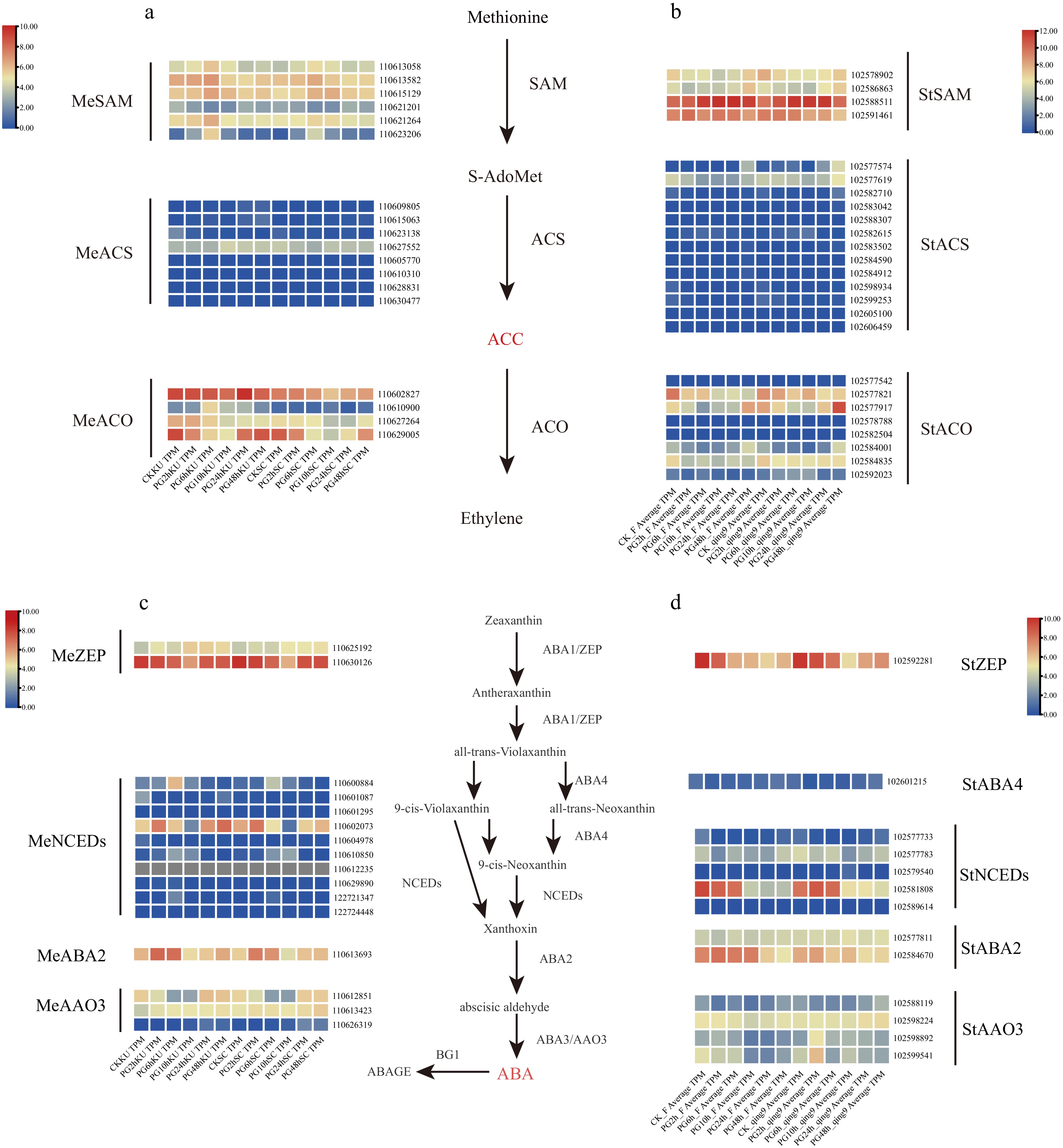Hormone biosynthesis pathway responses in cassava and potato under high-temperature stress (Heatmap: red, up-regulation; blue, down-regulation). (a) Ethylene biosynthesis pathway in cassava under heat stress. (b) Ethylene biosynthesis pathway in potato under heat stress. (c) ABA biosynthesis pathway in cassava under heat stress. (d) ABA biosynthesis pathway in potato under heat stress.