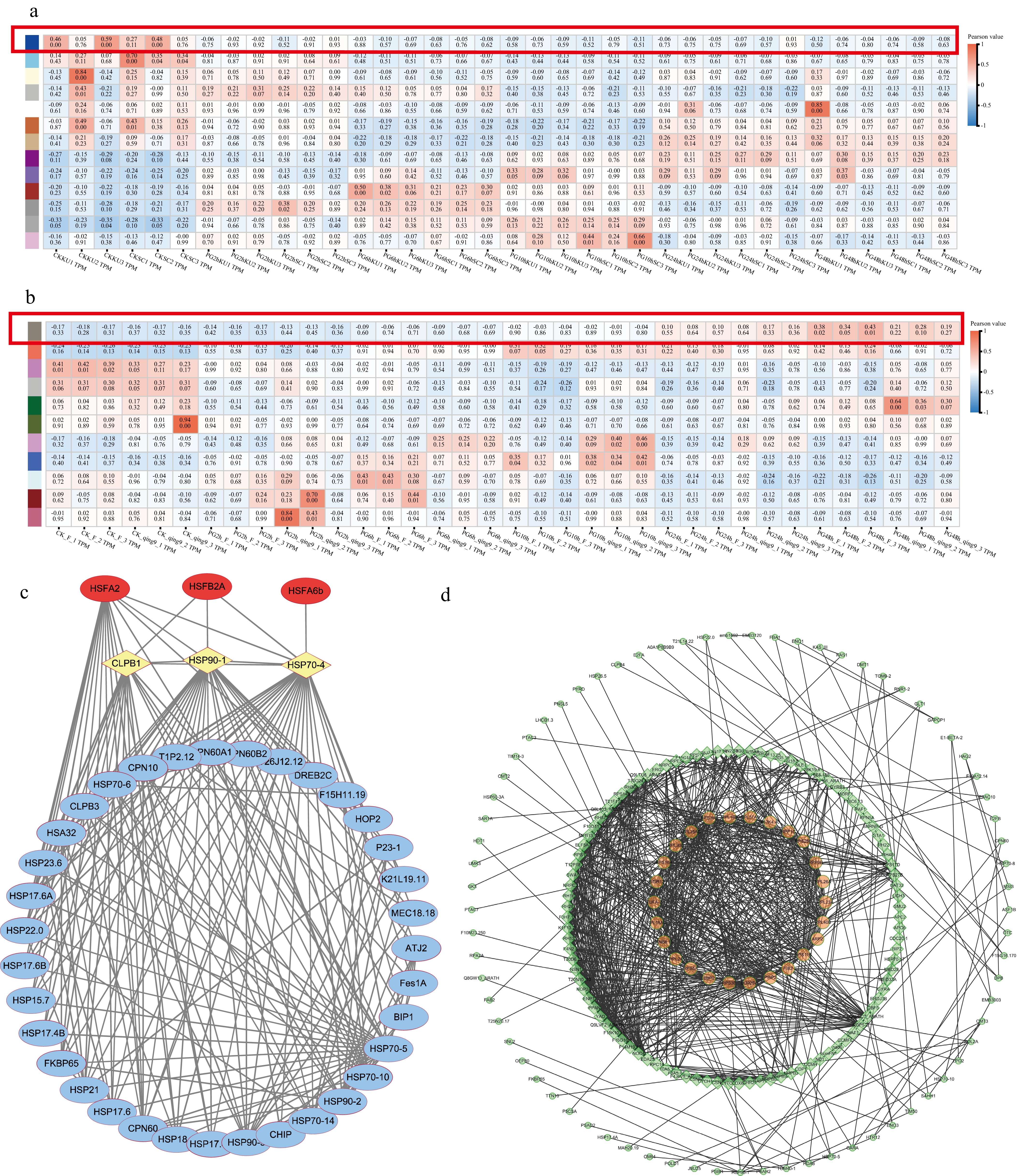 Co-expression network construction of consistently expressed genes under high-temperature stress in cassava and potato. (a) Module partition of the co-expression network of consistently expressed genes in cassava under heat stress. (b) Module partition of the co-expression network of consistently expressed genes in potato under heat stress (blue, down-regulated genes; red, up-regulated genes). (c) Network construction of the cassava blue module. (d) Network construction of the potato antiquewhite4 module.