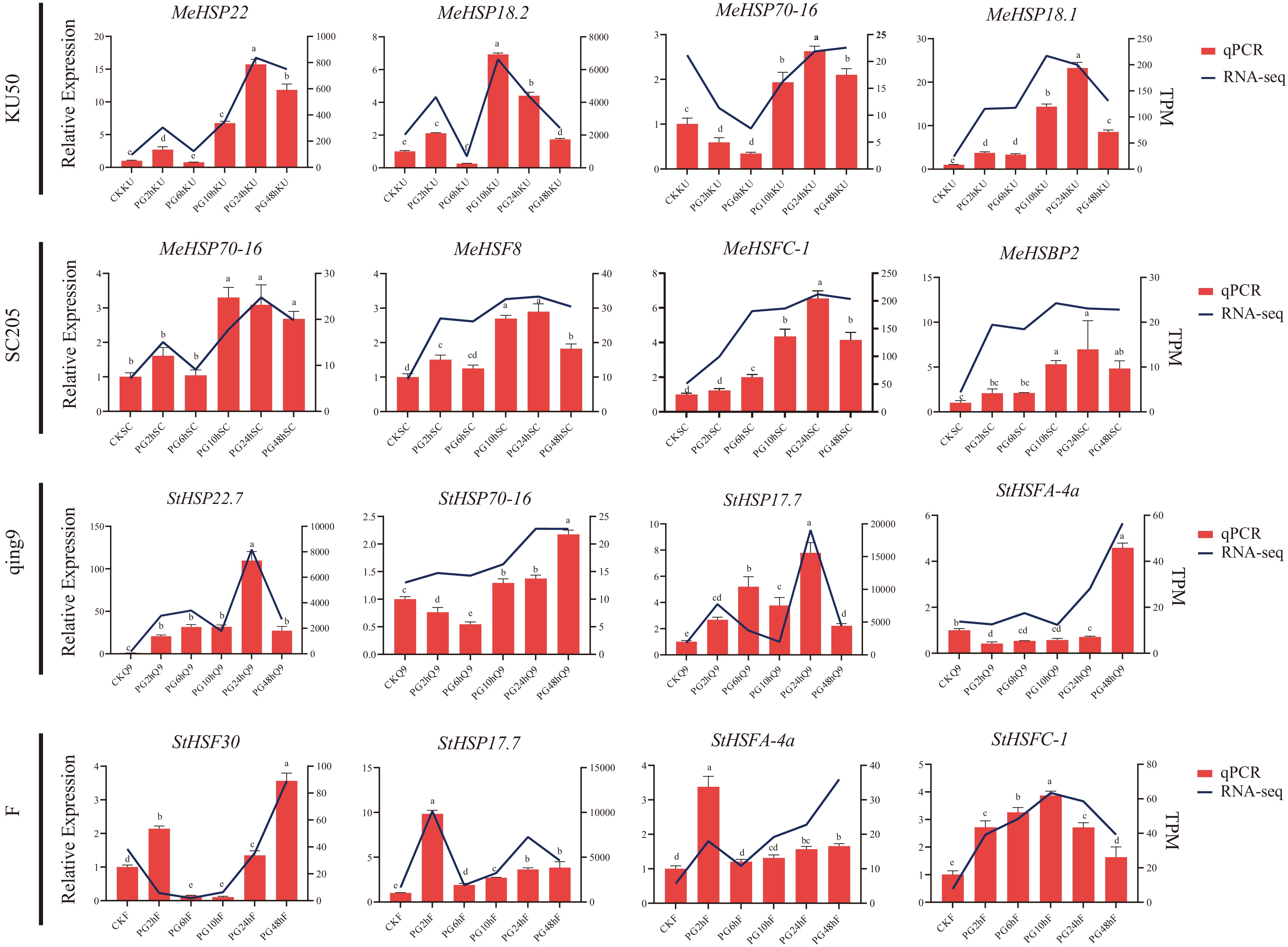 RT-qPCR validation of differentially expressed genes in heat-stressed leaves of cassava and potato. Bars represent gene expression levels determined by RT-qPCR; lines indicate expression trends from RNA-seq data. Lowercase letters in the figures/tables were used to indicate the results of Tukey's HSD test; means bearing different letters differ significantly at p < 0.05.