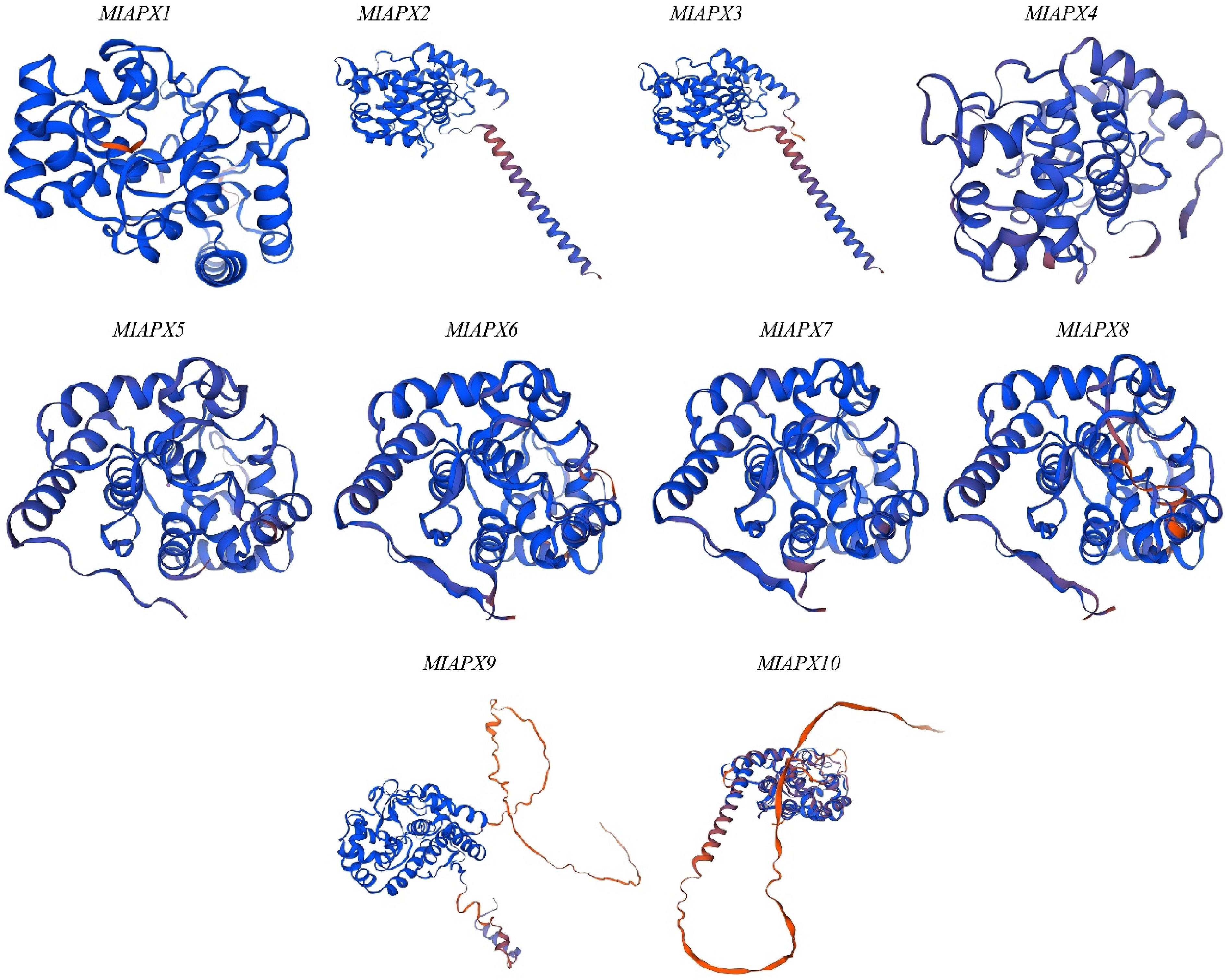 Represents the 3D structures of ten MiAPX genes which were generated using SWISS-MODEL.