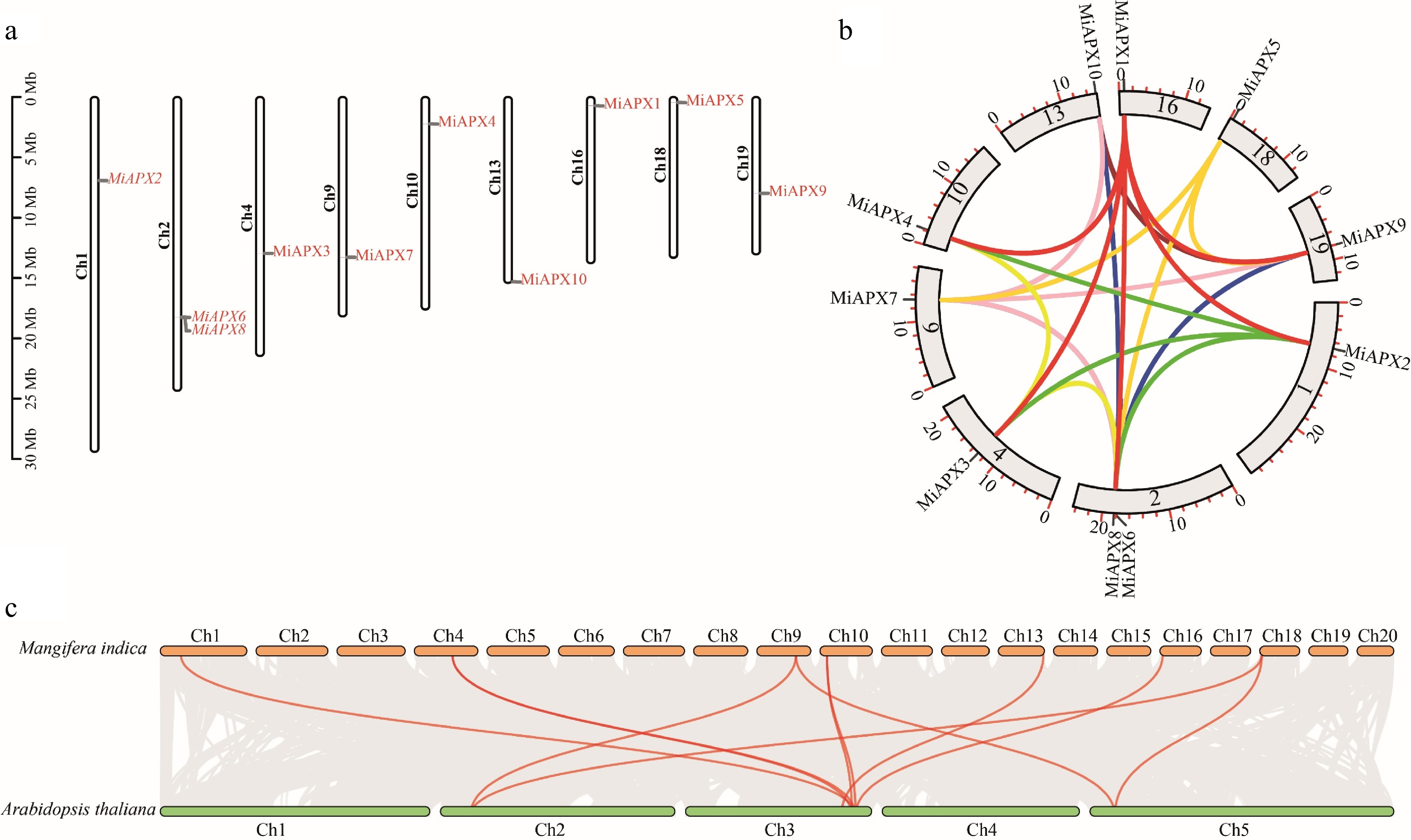 (a) The distribution of ten MiAPX genes across ten mango chromosomes is shown, with genes marked in red and chromosomes in black. (b) A circos plot illustrates the duplicated MiAPX gene pairs within the mango genome. (c) Syntemic relationships between APX genes in mango and A. thaliana were shown, with orange and green boxes representing the respective genomes. Red lines highlight conserved orthologous gene pairs.