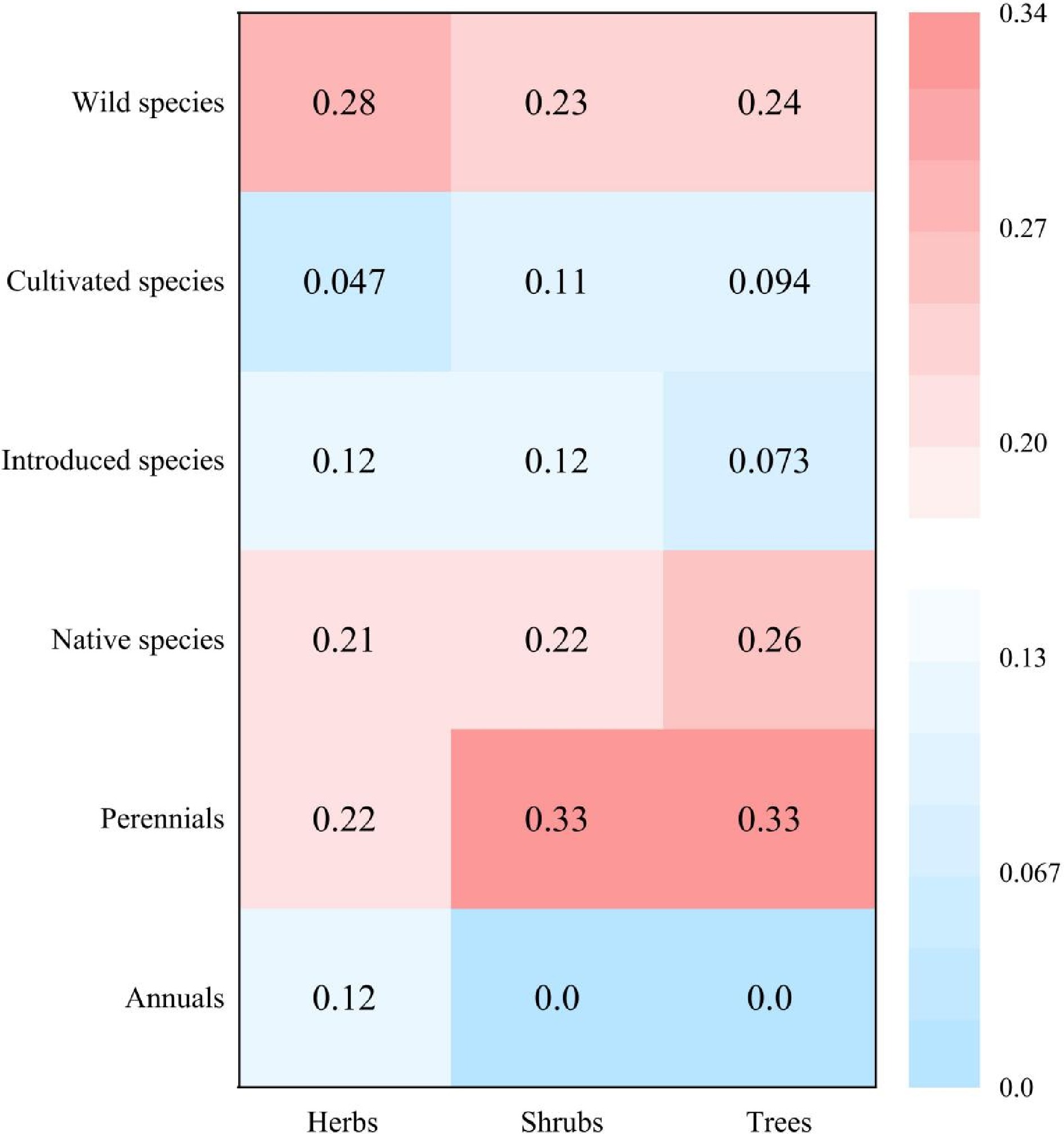 Heat map of the percentage of the total species richness (considering only the mathematical totals, i.e. the sum of the species richness of each type on the y-axis) of the different species type established on the basis of herbs, shrubs, and trees.